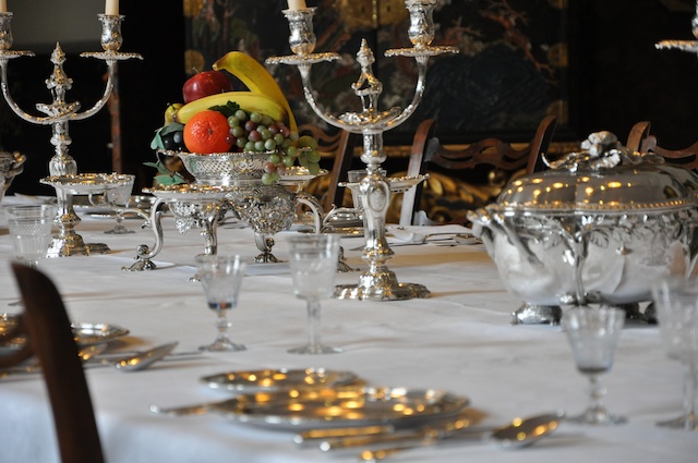 The Berkeley family still lives in private parts of the castle. The rooms open to the public are furnished in period, and one gets a very good sense of what life was like for previous occupants. The table in the dining room, previously the billiard room, is set for dinner with Georgian silver, shown in detail in the top picture.