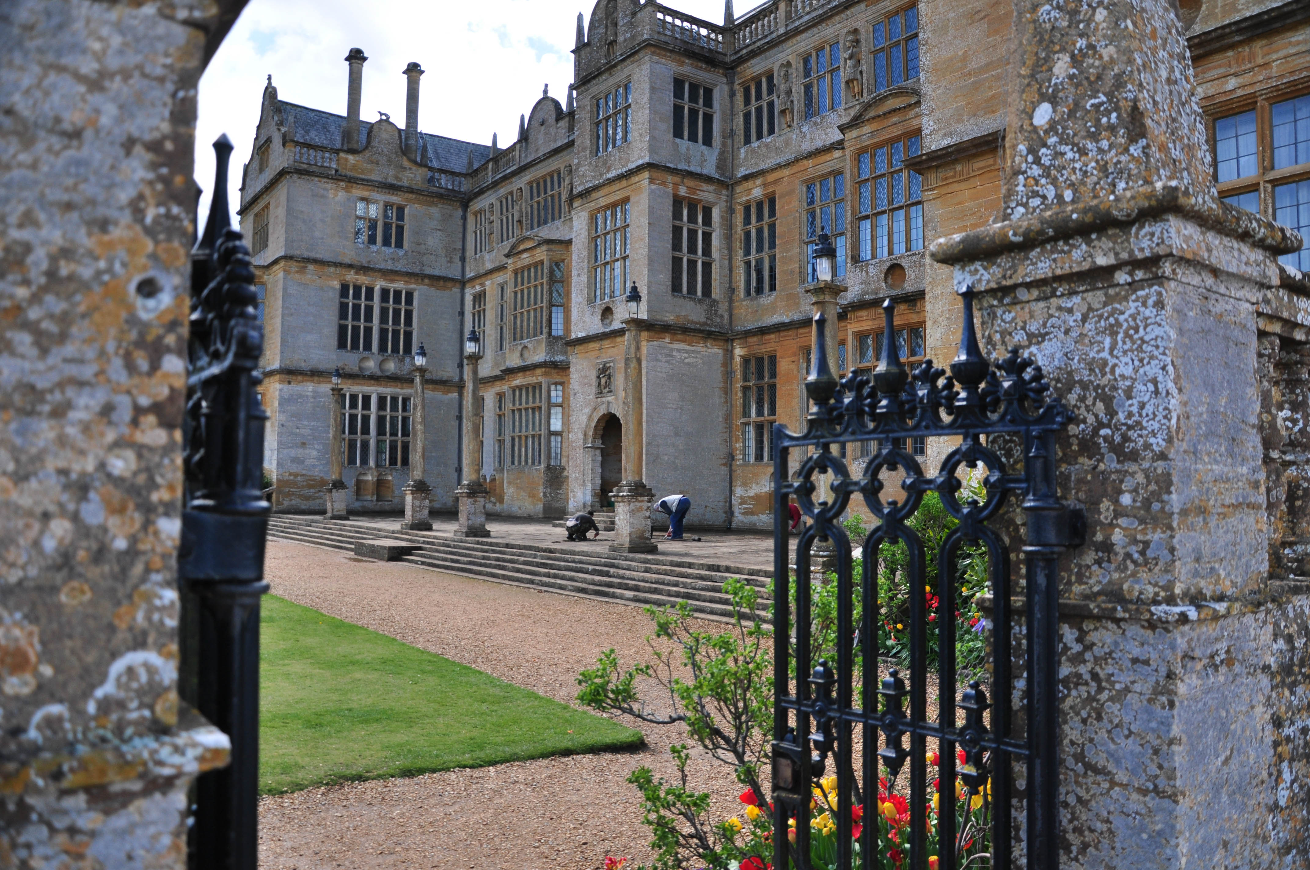 The East Facade of the House. We were fortunate to get a beautiful day; the stone just glows against the blue sky. This angle of the house provides the most complete look, and clearly shows the “E” floor plate so often seen in Elizabethan houses.