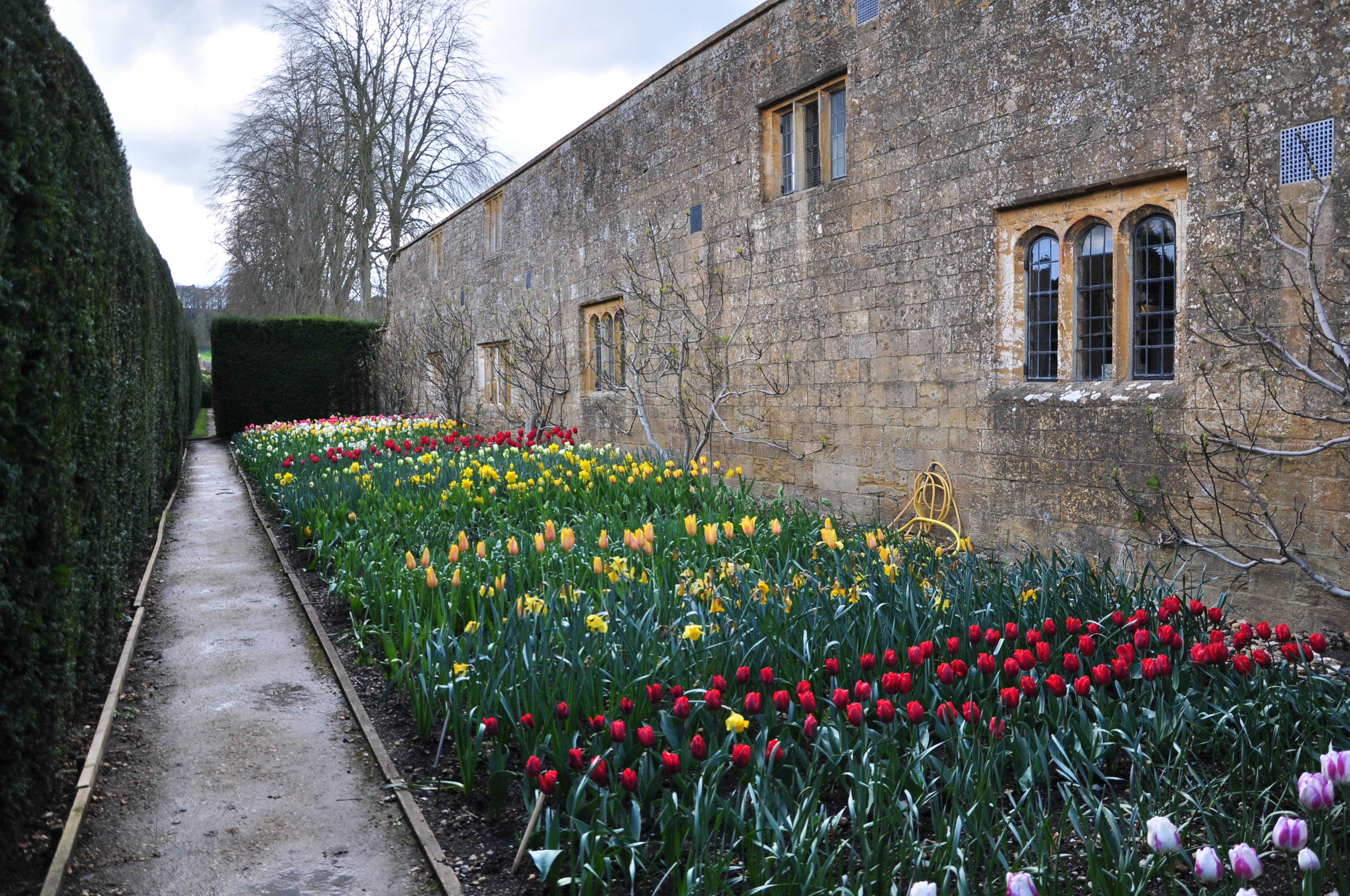 While red and yellow tulips are not my favourite combination, they are stunning here. The colour is just eye-popping, and the rich tones marry very well with the “Ham Stone” which forms the exterior of the house and the garden pavilions.