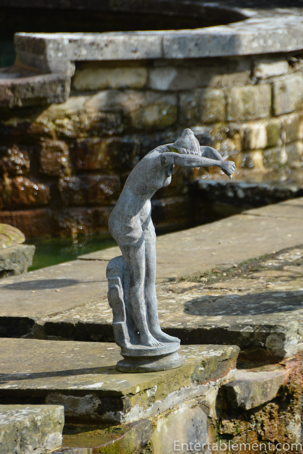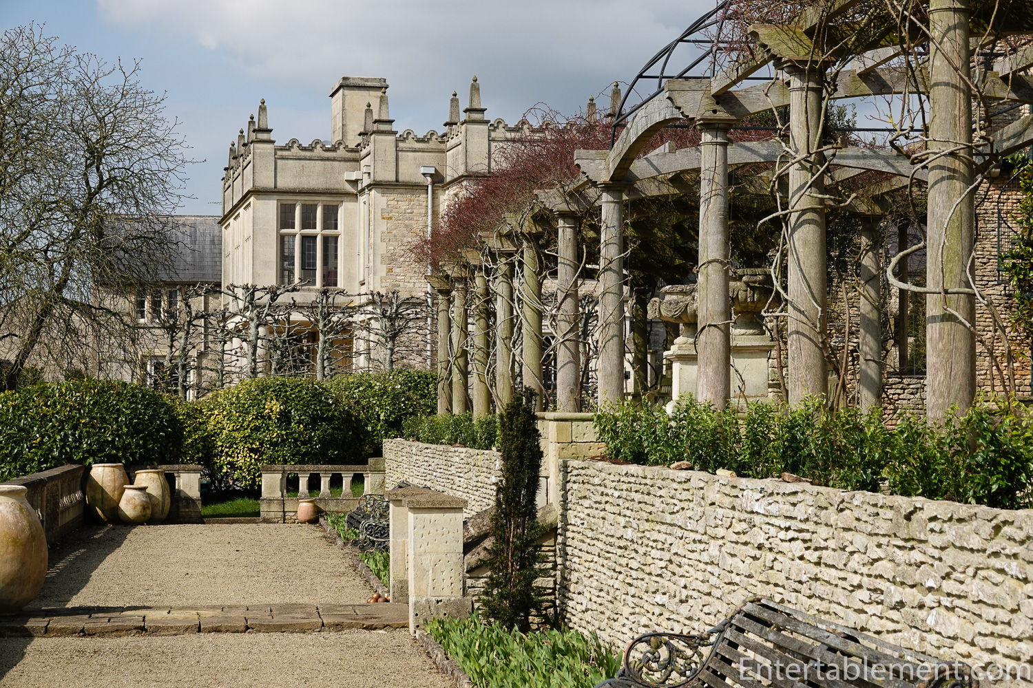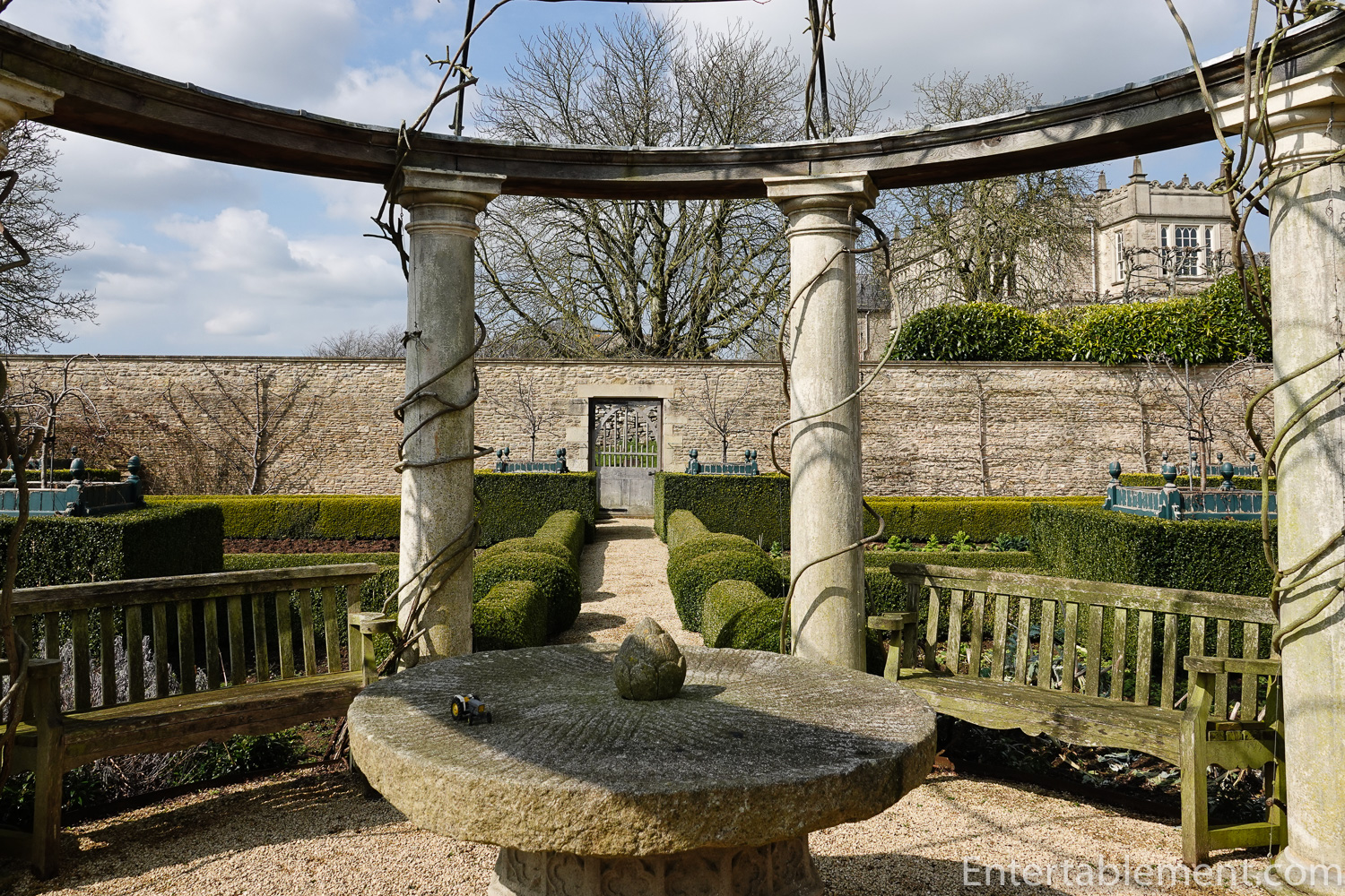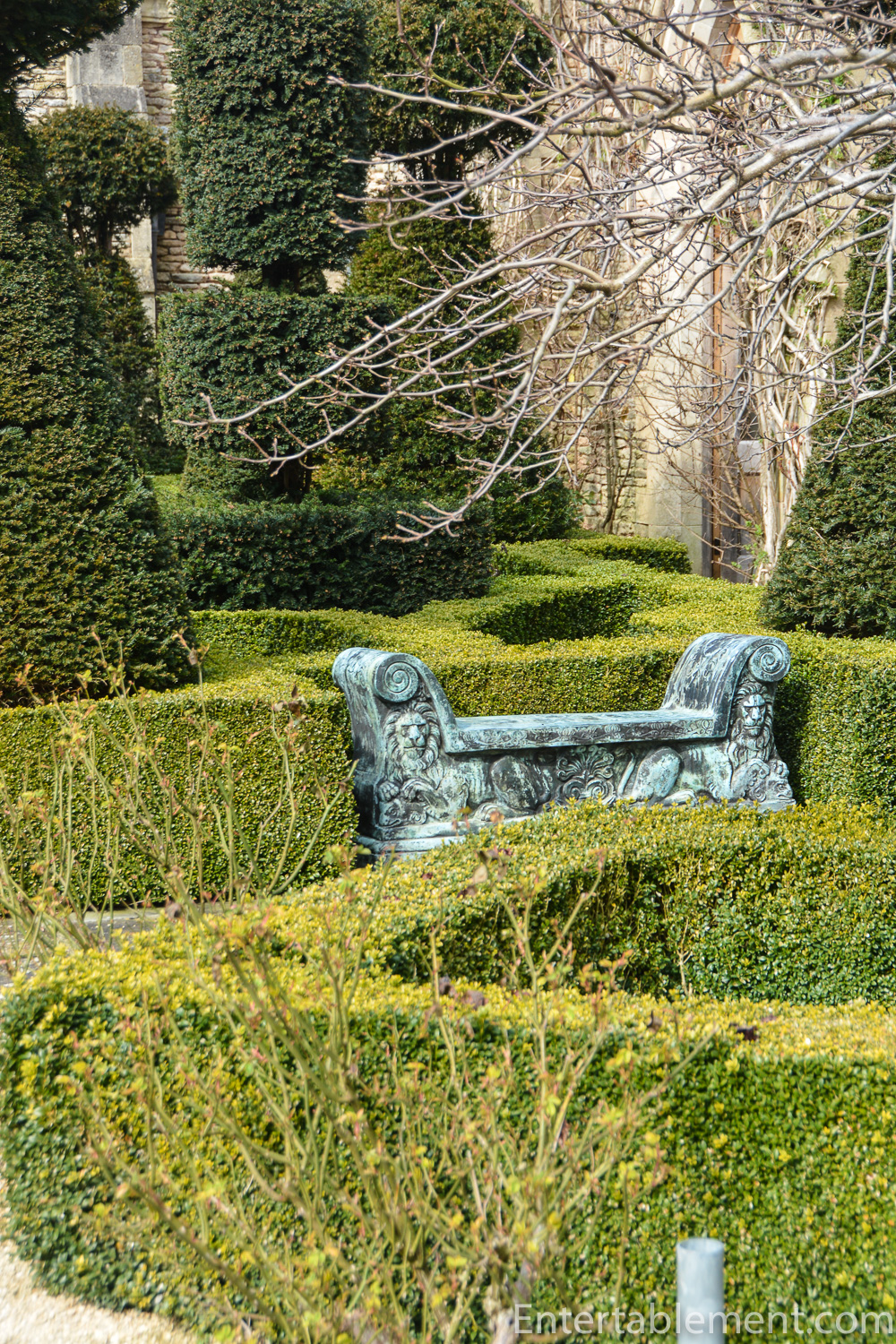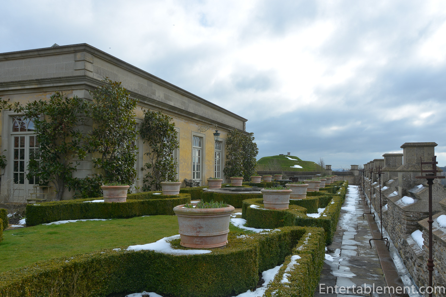 Moving to the right of the photo below you can see just see where the stairs go up to the terrace outside the Orangery – they’re in shadow so a bit hard to spot. The stone wall incorporates vestigial remains of an abbey cloister to give an overall “Monastic settlement” effect.