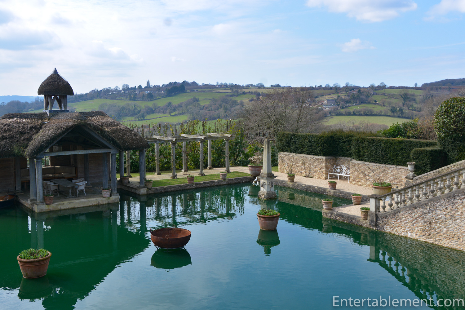 The Orangery is built at the back of a courtyard at the very top of a hill, overlooking a terrace, which in turn drops down to an outdoor swimming pool. You can just see the edge of the roof of the Orangery at the top of the photo below. The French doors lead into a gorgeous grotto-style indoor swimming pool, located immediately below the Orangery. So cool! The pool is only open in the wintertime; the family keeps it covered during the summer which is prime wedding season. A wise move – one can just imagine the antics a lå the pool fiasco in It’s a Wonderful Life.
