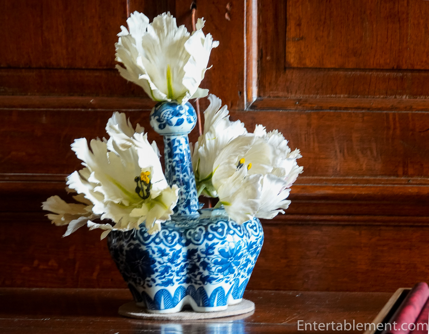 Thus the house bursts with artwork and furniture from around the world, particularly Holland. Lots of defltware! The parrot tulips are actually paper, but they look amazingly realistic.