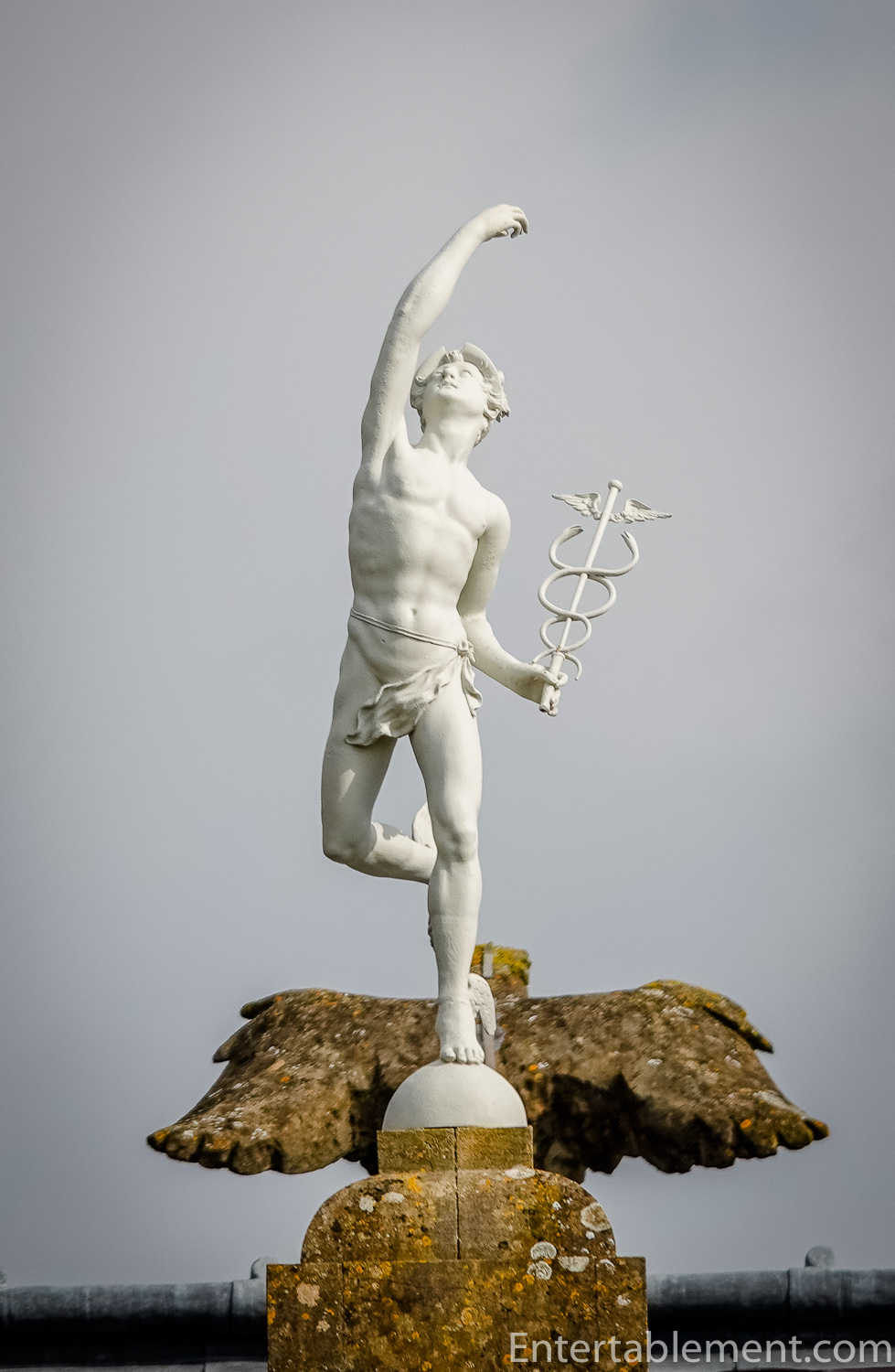 Judging by the Caduceus and the wings on his heels, the statue on the very top of the roof is Mercury. My nifty-swifty zoom lens in action!
