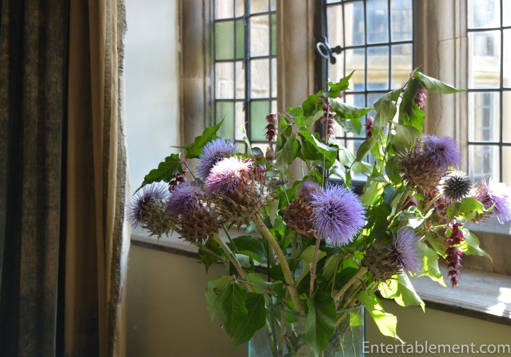 The curtains were of rich fabric, which I was not able to capture effectively. But the colours were picked out in the lavender thistles.