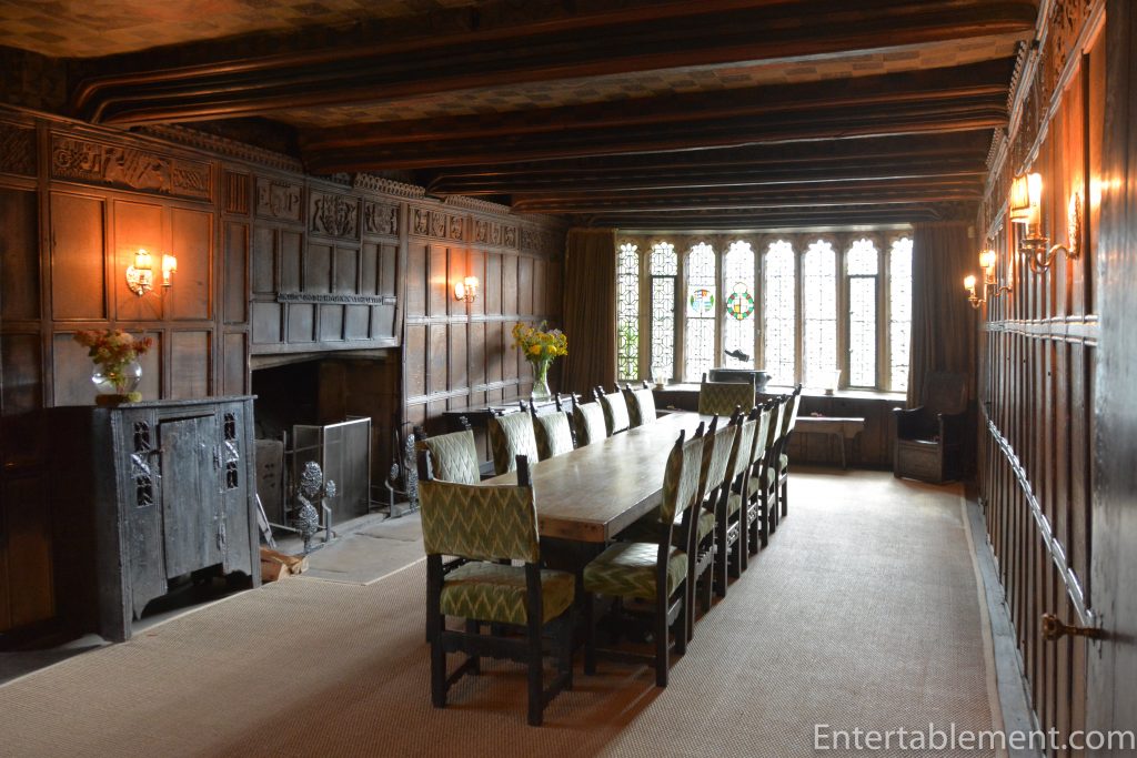 The dining room gets a lot of use. The plaster ceiling is lower than those in a lot of the house and it’s furnished with comfortable chairs. It’s known as “The Parlour” and dates from about 1500. It was panelled in 1545 and shows the Boar’s Head Crest and armorial shields of many generations of the Vernon family. You may just be able to see the royal coat of arms and the motto ‘Drede God and honor the Kyng’, over the fireplace. The table is a 20th Century copy of the ancient table in the Great Hall.