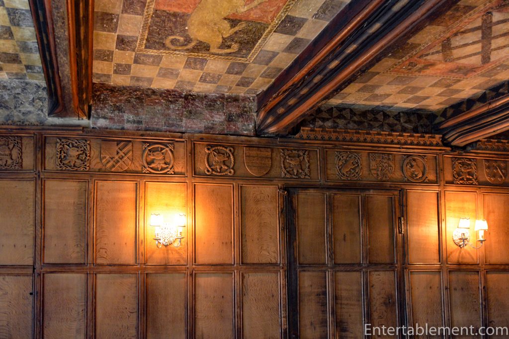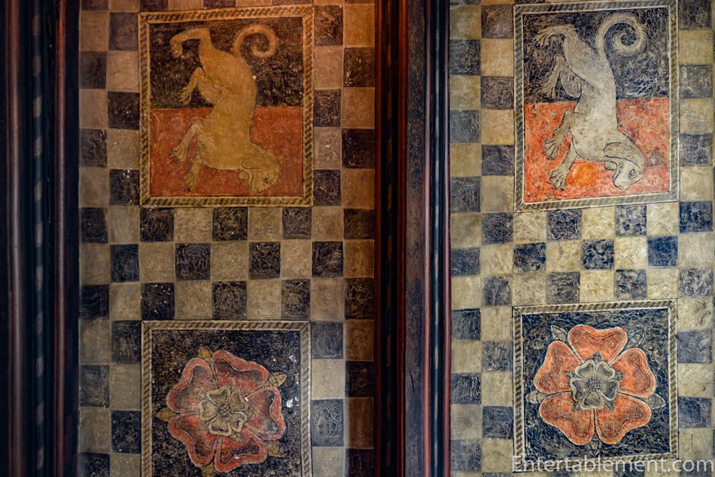 The panels in the ceiling are painted with the Tudor Rose and Talbot Dogs, the emblem of Anne Talbot, the wife of Henry Vernon.