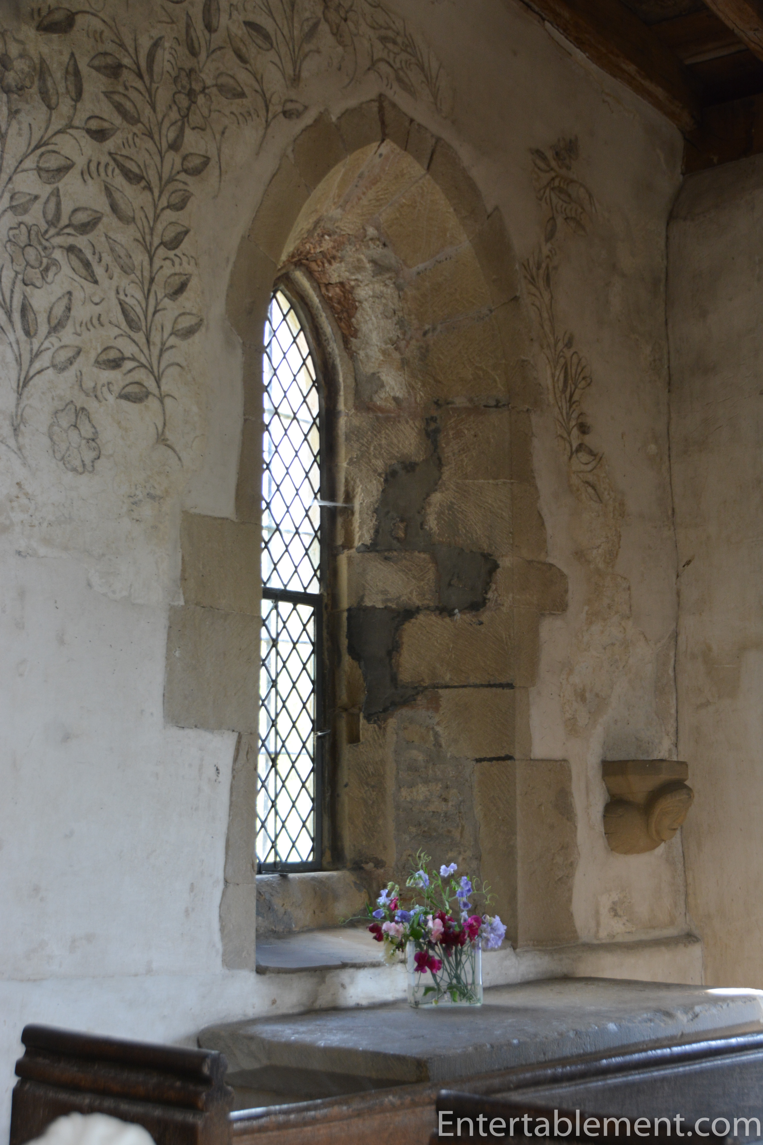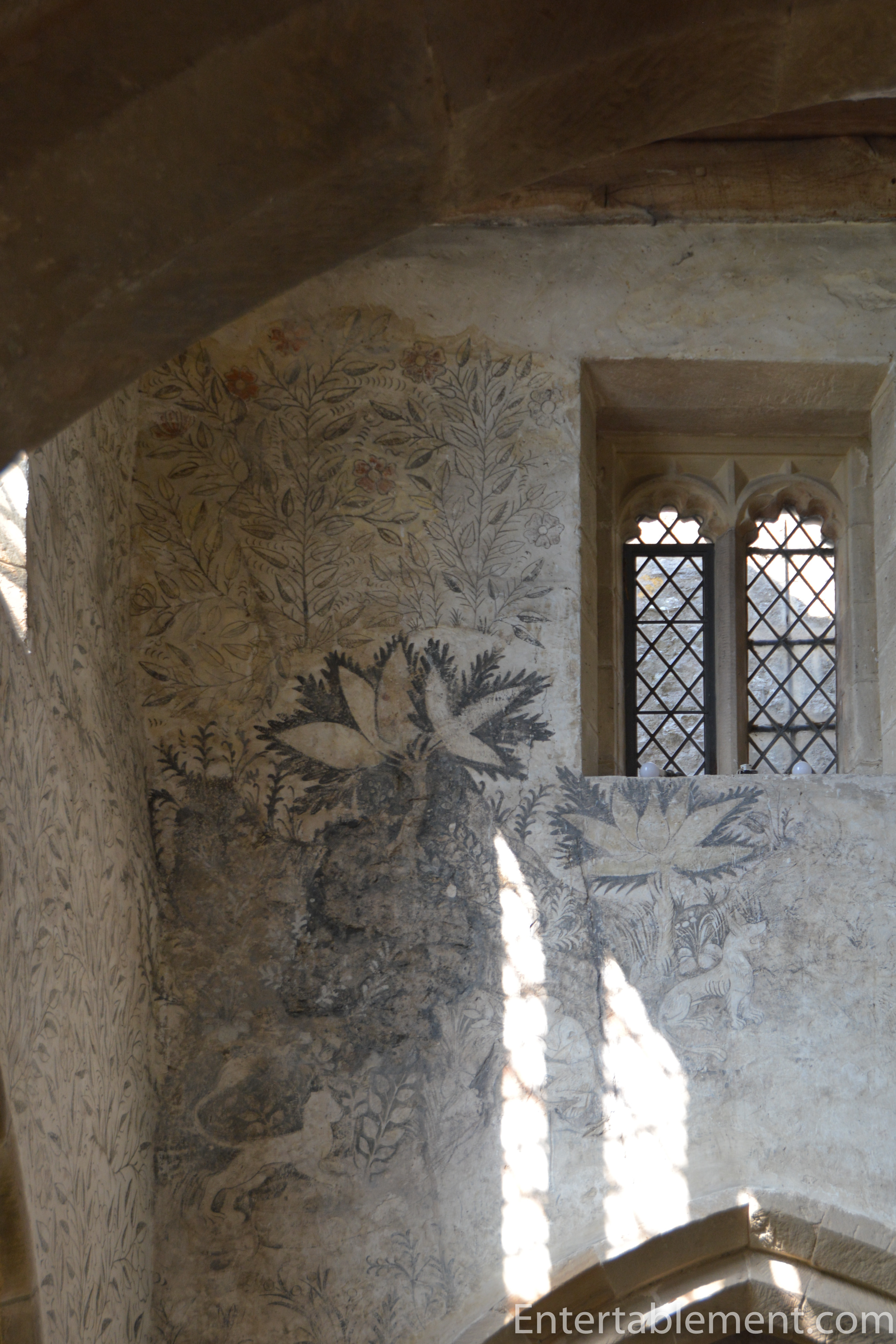 The chapel has 15th-century wall paintings, and an early 15th-century Nottingham alabaster reredos (the screen behind the altar). The paintings are beautifully detailed, especially the flora and fauna.