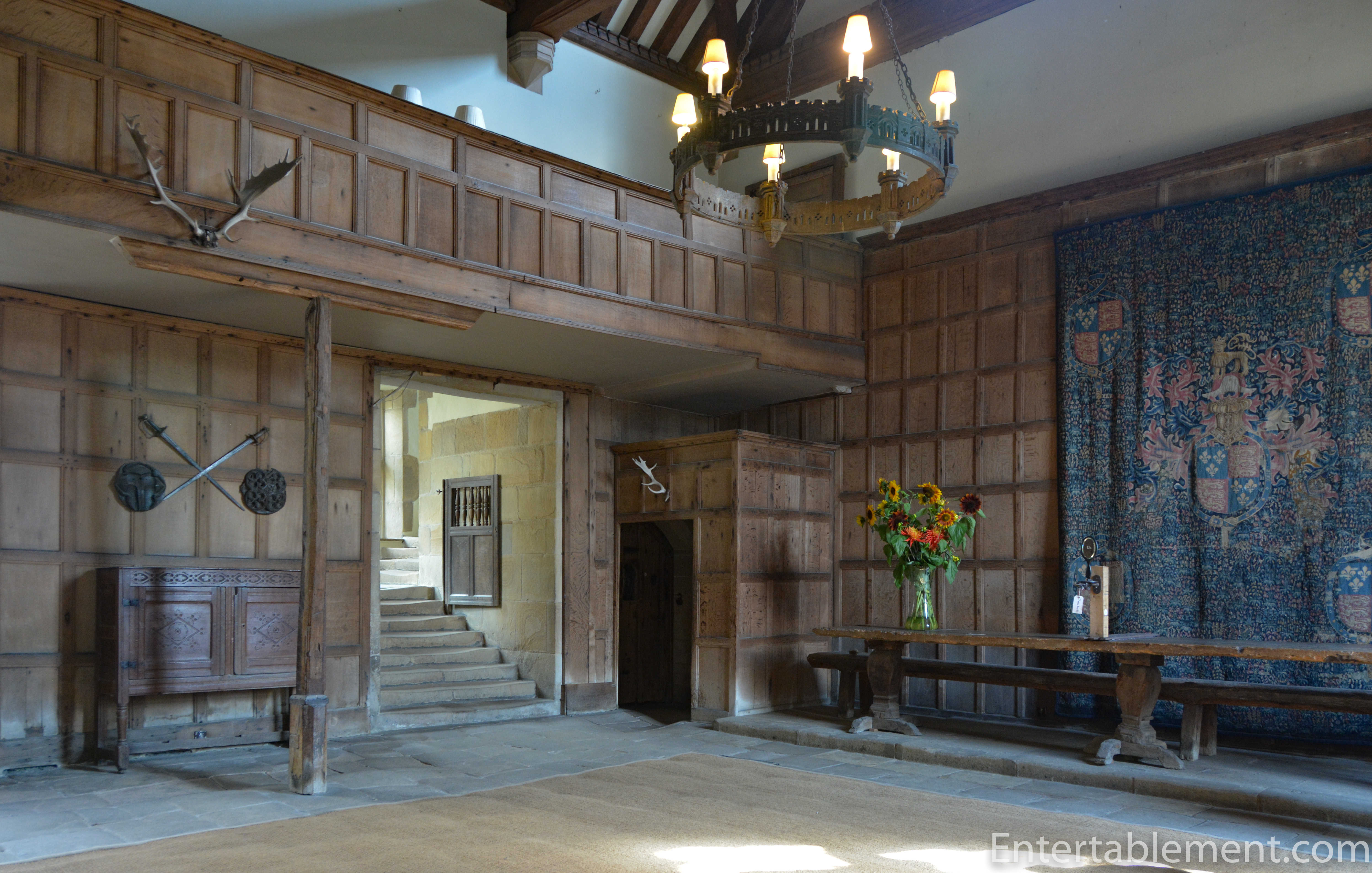 The panels in the ceiling are painted with the Tudor Rose and Talbot Dogs, the emblem of Anne Talbot, the wife of Henry Vernon.