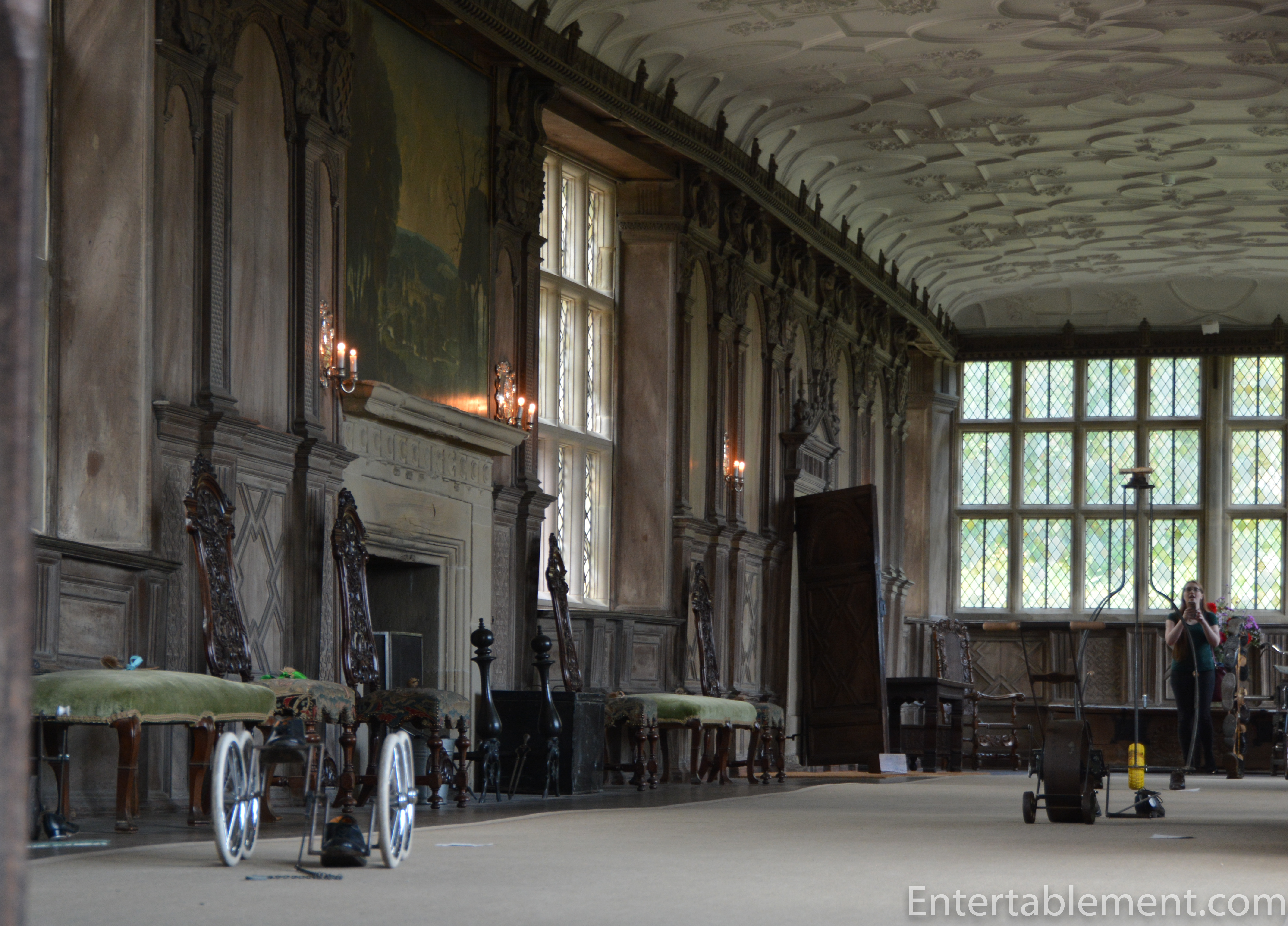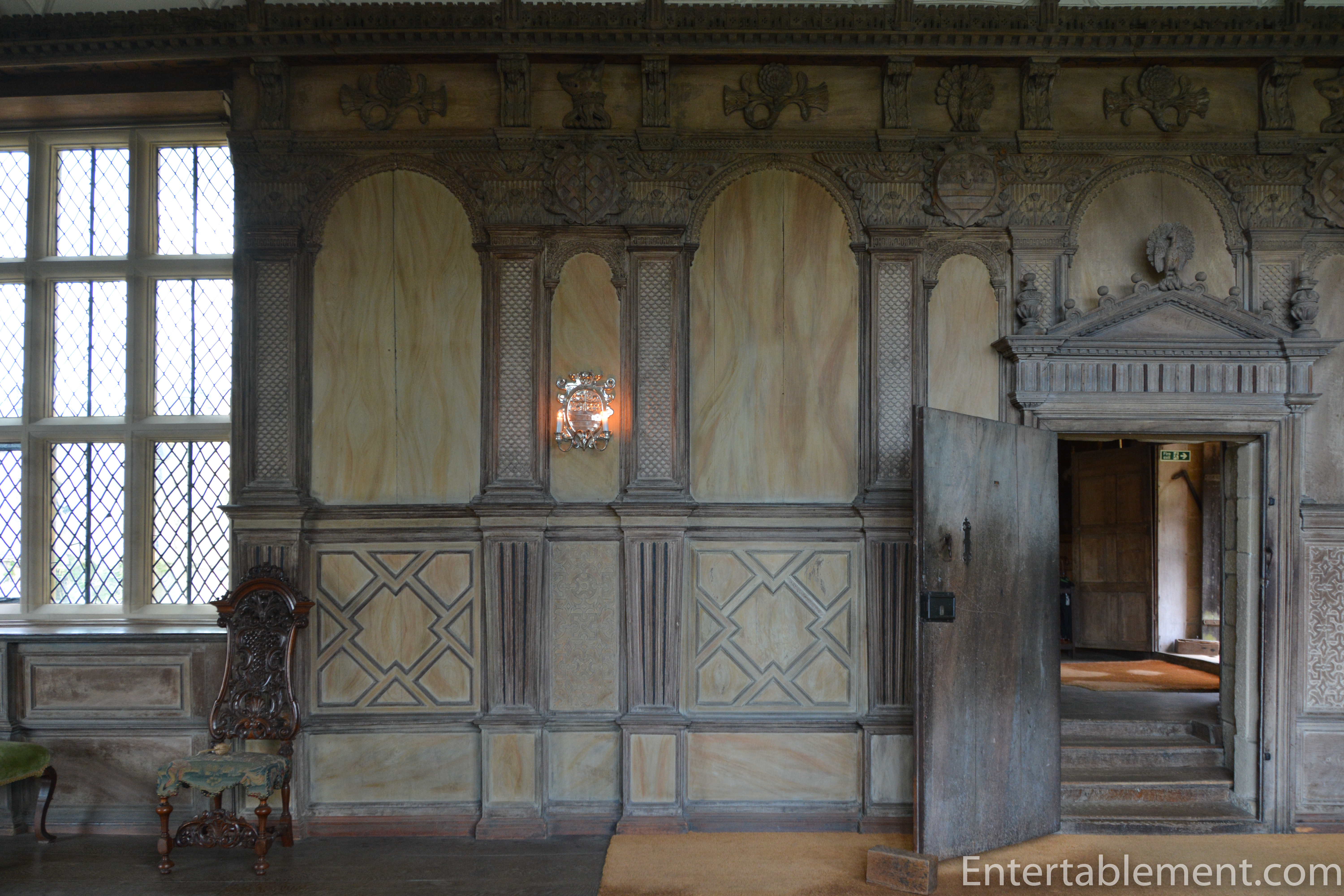 The great hall, below, contained mechanical ride-on toys, much to the entertainment of some of the other guests. But it was the panelling and the windows that caught my eye.