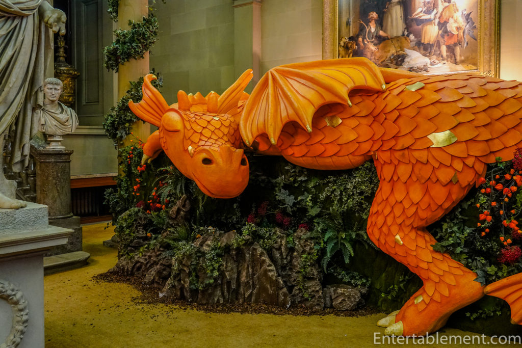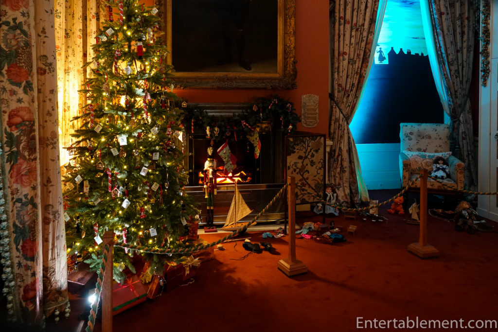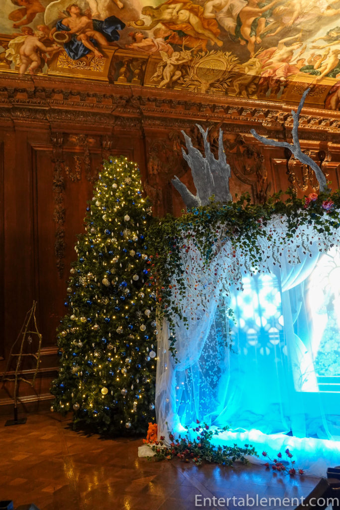 The rain had eased somewhat as we made our way from the Chatsworth Christmas Market into the house itself. We had picked up some clues that the Christmas theme was going to be Fairy Tales, and on our evening visit, saw the courtyard lit up with spooky shadows of Cinderella’s coach,