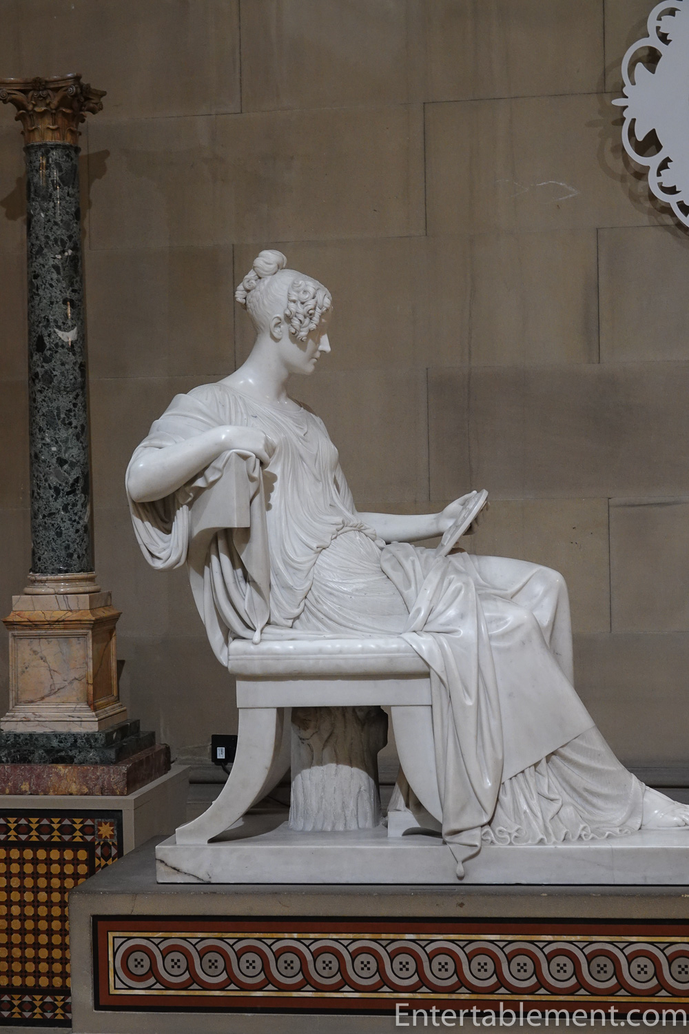 Just before we moved through to the sculpture gallery and out into the Orangery Shop, we noticed a display of beautiful Blue John urns. The stone is mined in the area, and it’s commonly thought that the name Blue John is a corruption of the French Bleu Jaune or Blue Yellow. The blue is more purple, I think. Lovely!