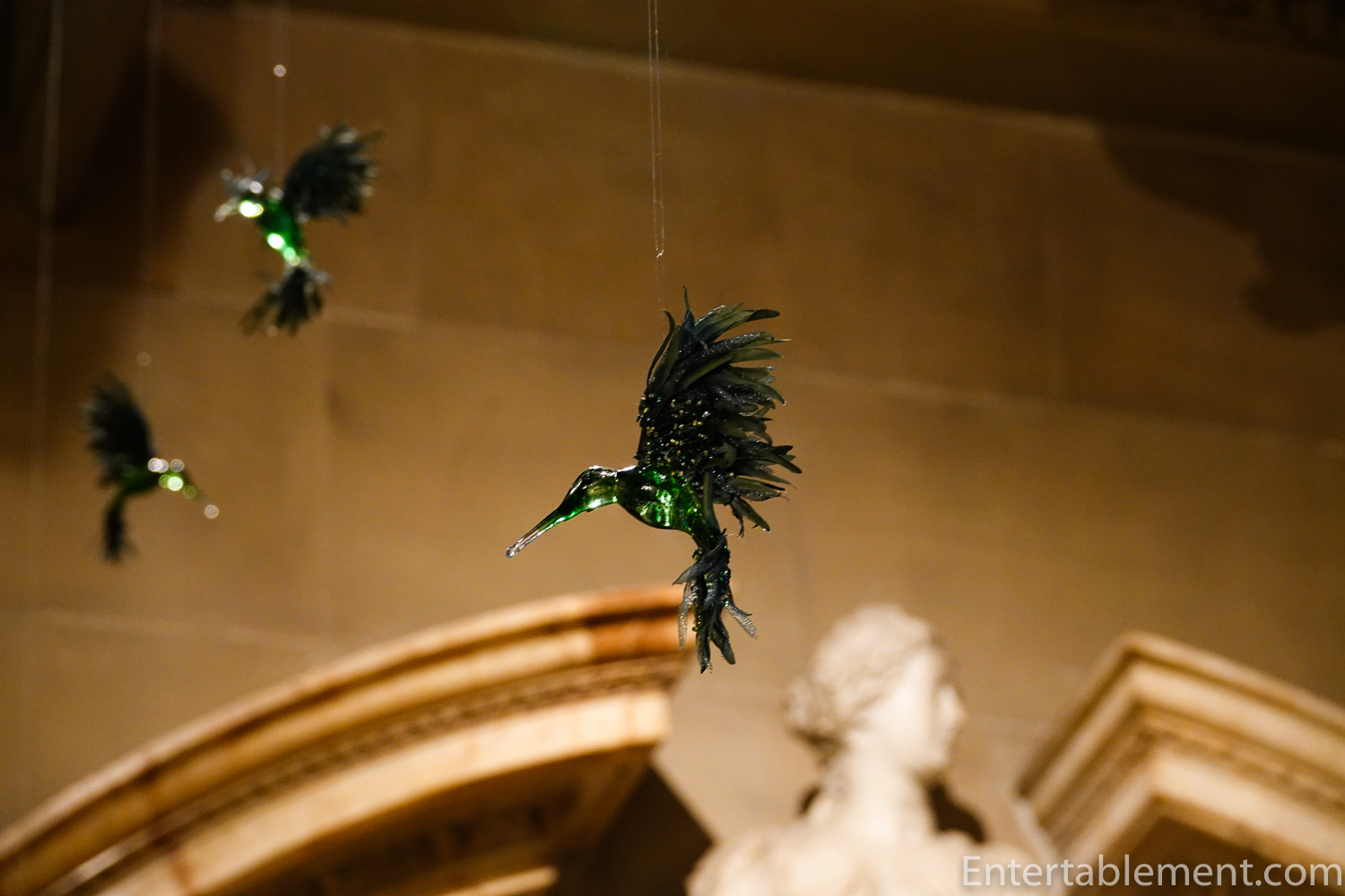 Delicate glass birds twirled gently in the light.