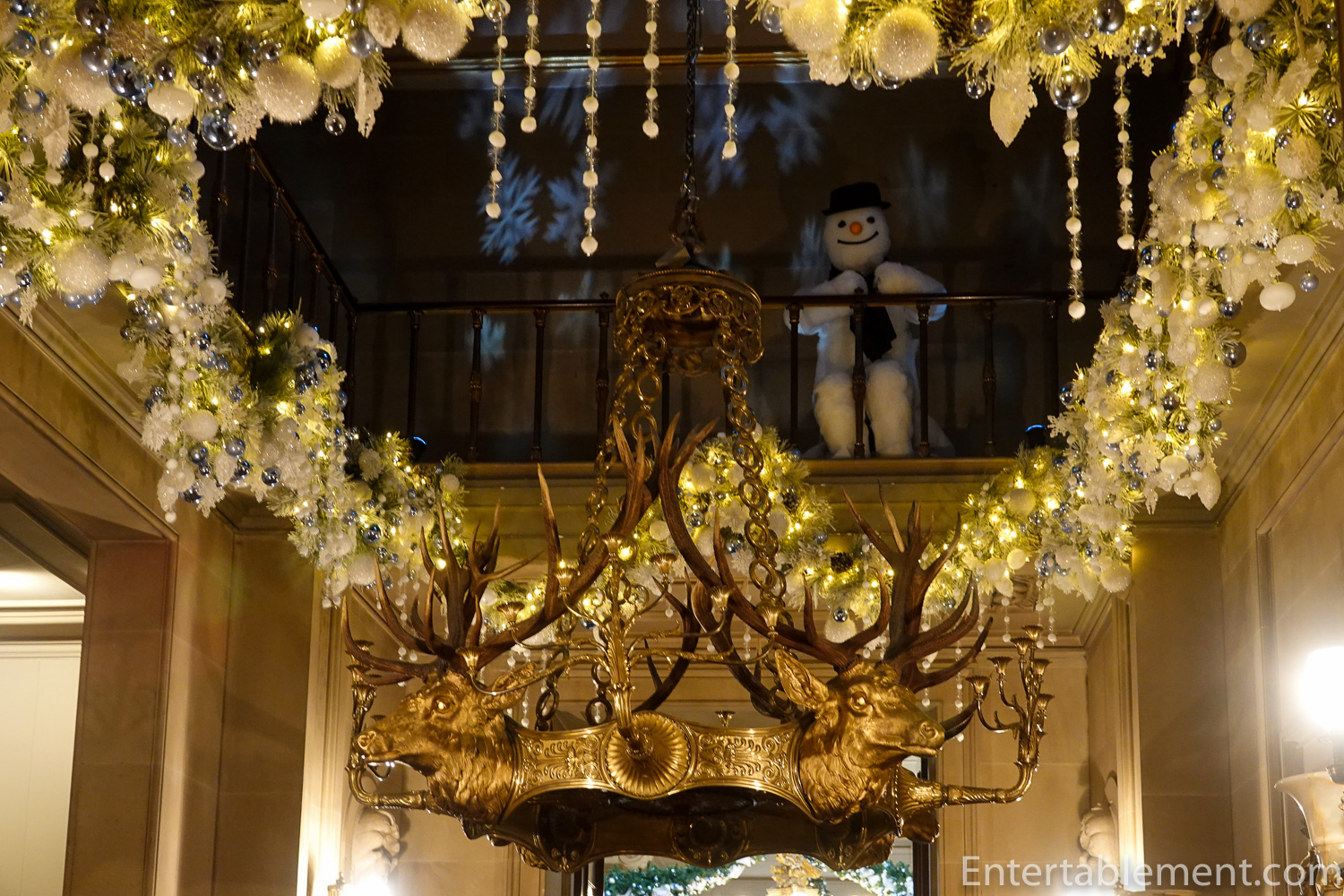 The deer antler chandelier was surrounded with baubles and lights.