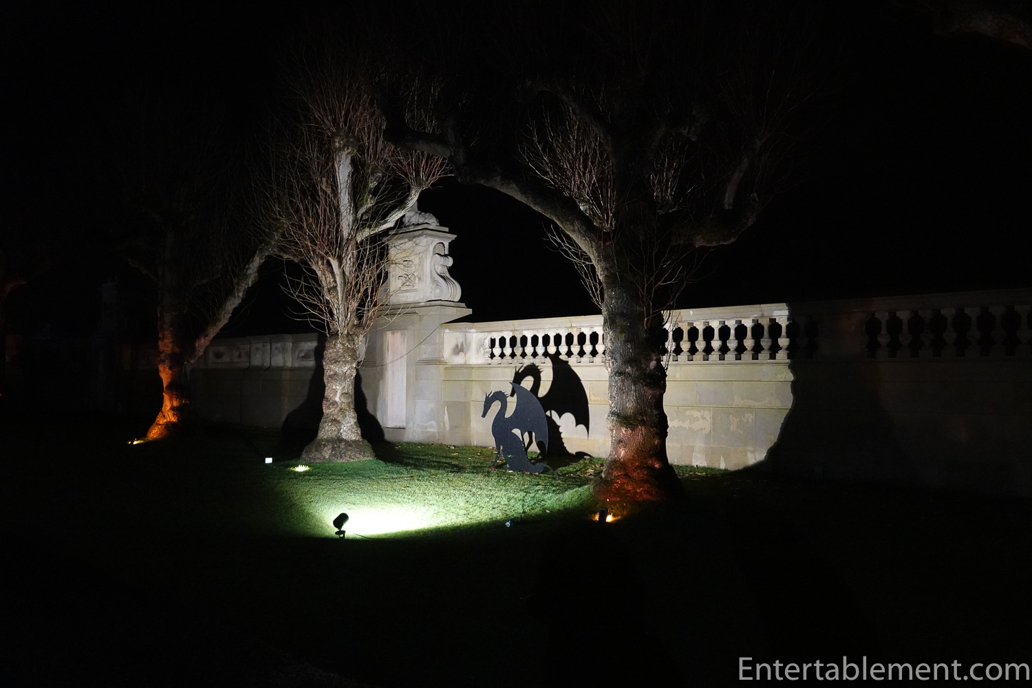 The rain had eased somewhat as we made our way from the Chatsworth Christmas Market into the house itself. We had picked up some clues that the Christmas theme was going to be Fairy Tales, and on our evening visit, saw the courtyard lit up with spooky shadows of Cinderella’s coach,