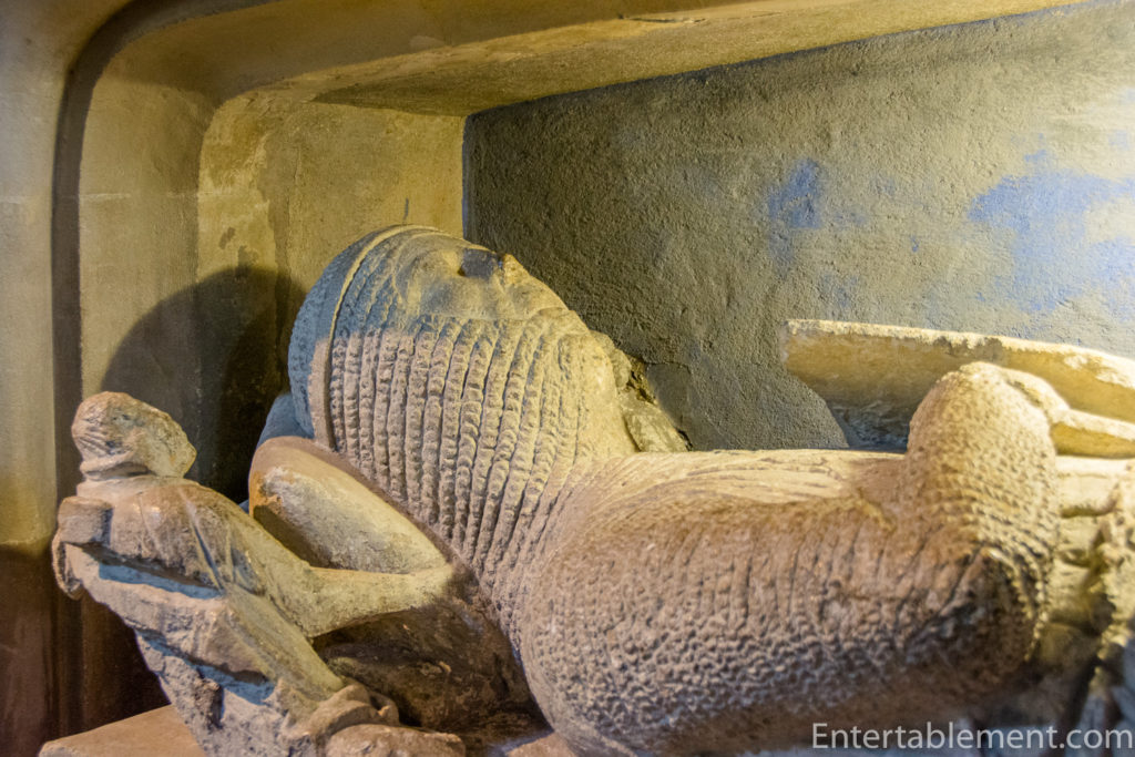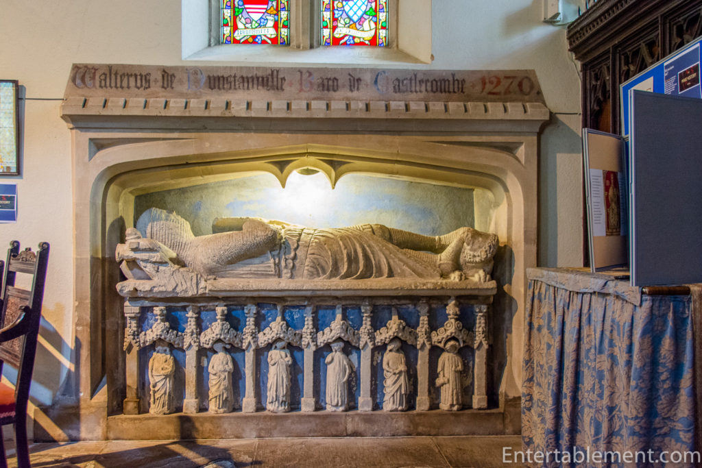 Things got a little more sinister a bit further inside the church, with the effigy of Walter de Dunstanville, a 13th-century crusader. According to “Find a Grave”, his hand on the drawn sword indicates death in battle and the legs crossed at the knees symbolises that he went on two crusades. (One wonders what the symbol for three crusades is). Sir Walter was the Lord of the manor, hence his prominent burial after his death in 1270