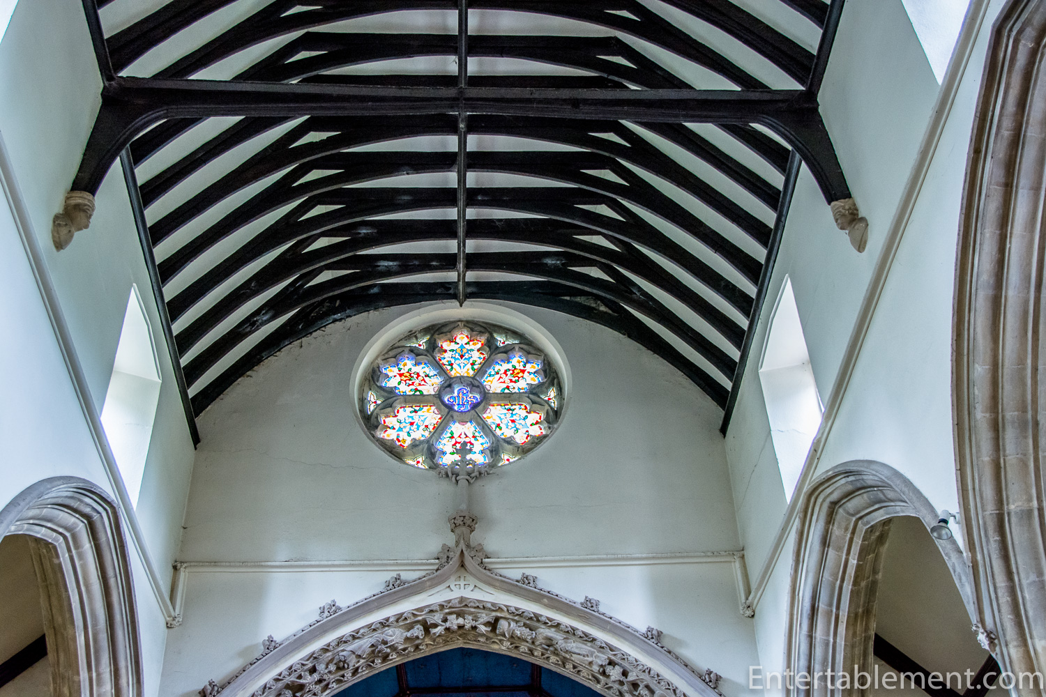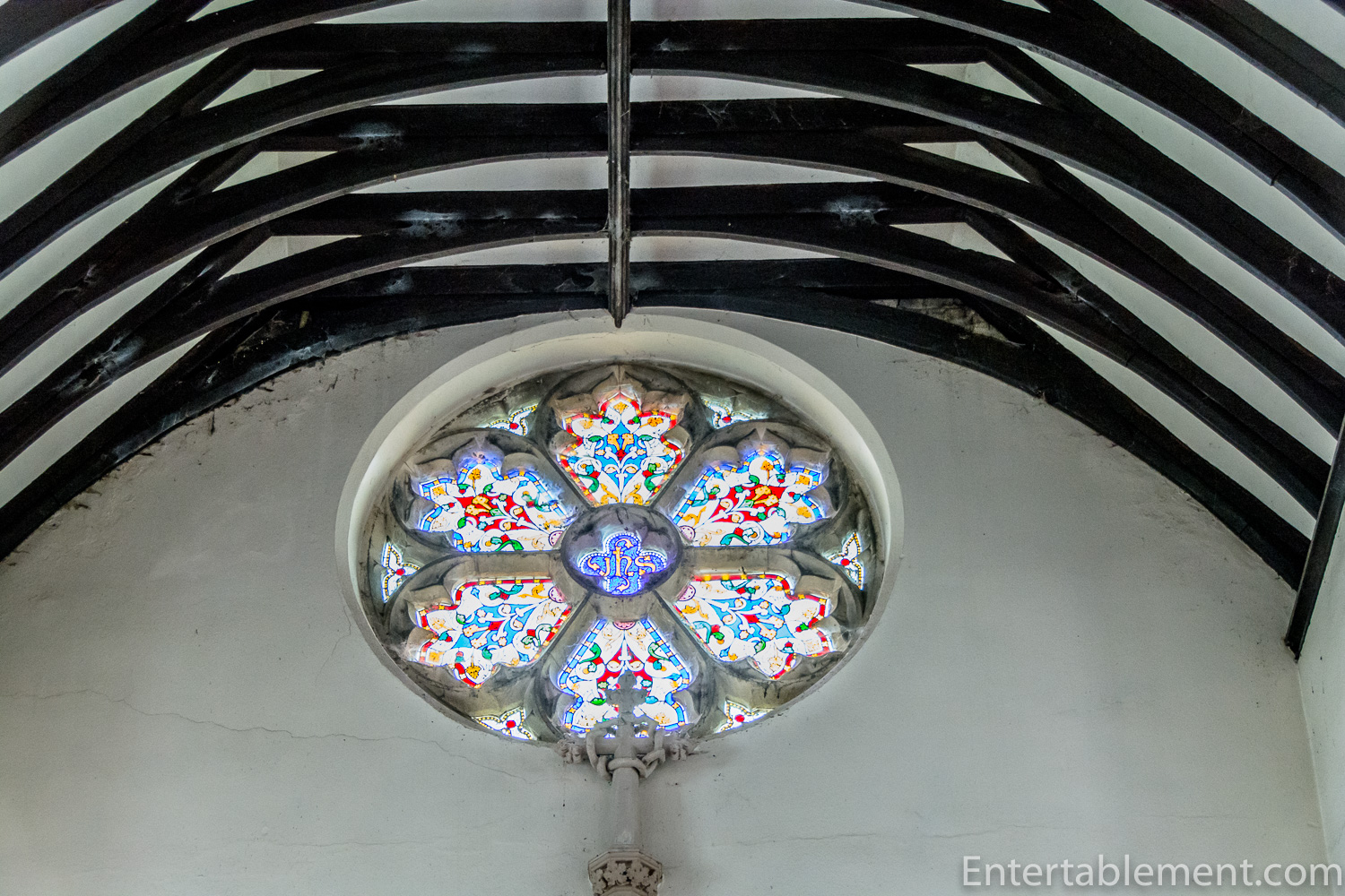 The church has a simple beamed ceiling, with a lovely stained glass, rose window.