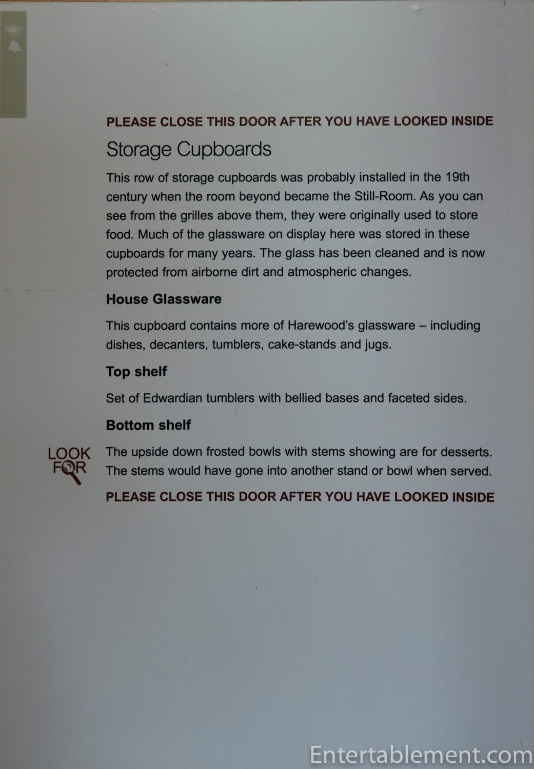 Shelves upon shelves of glassware. As you can see, details on each cupboard’s contents were posted inside the door, each with exhortations to PLEASE CLOSE THE DOOR AFTER YOU HAVE LOOKED INSIDE.