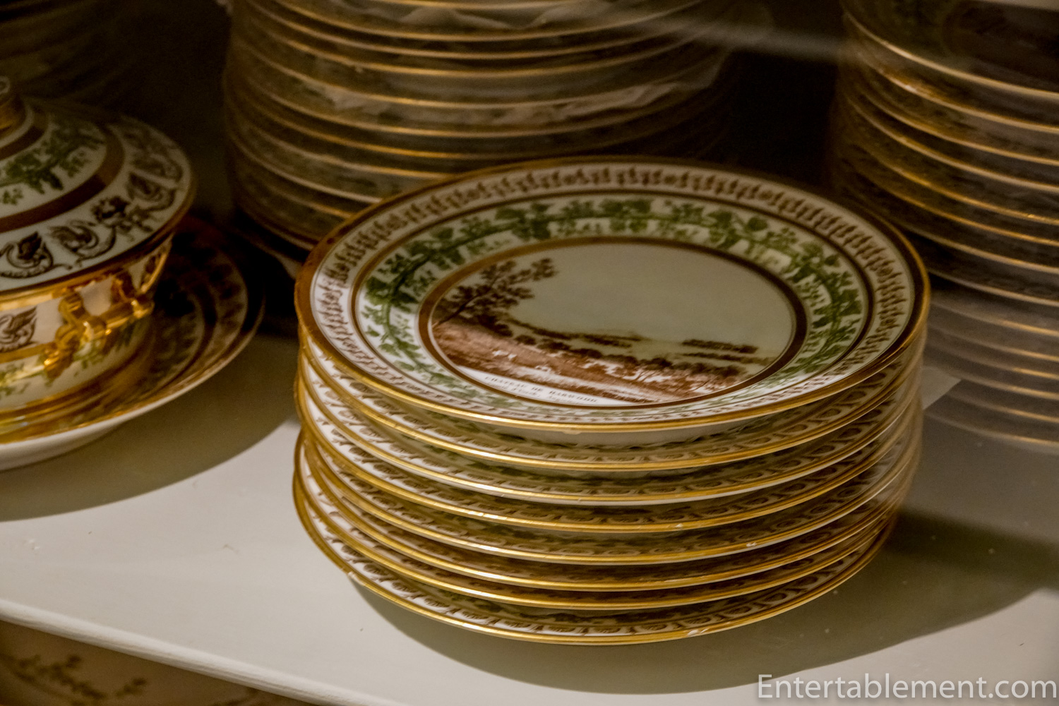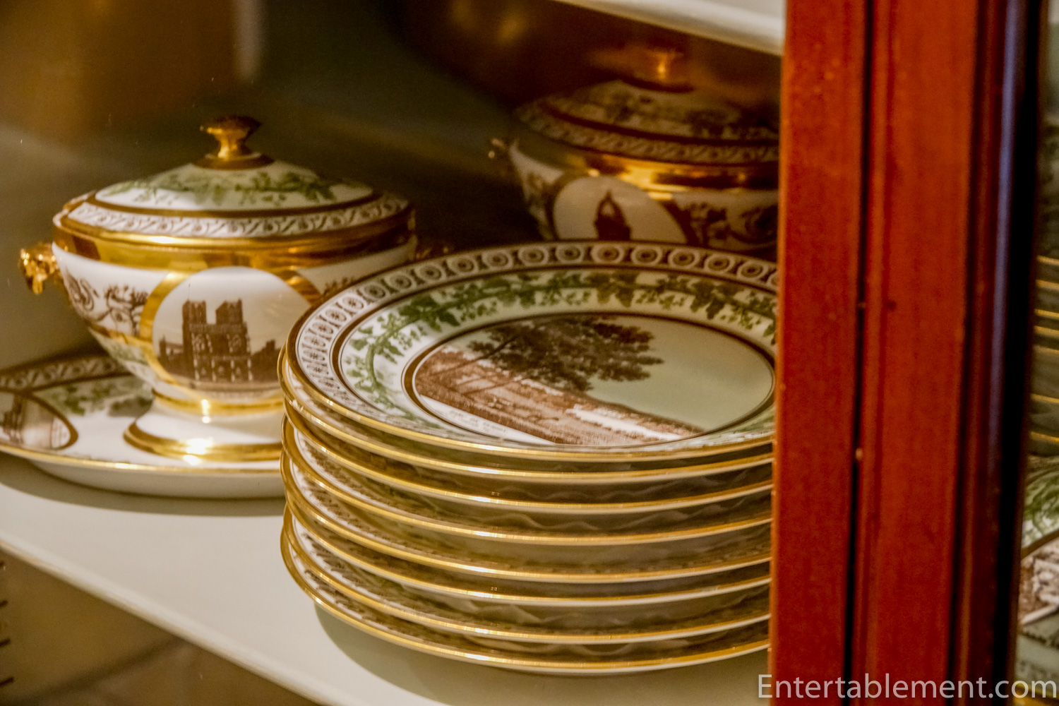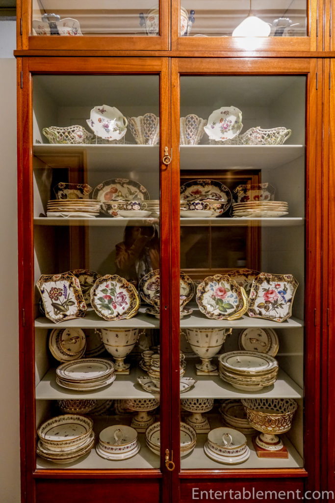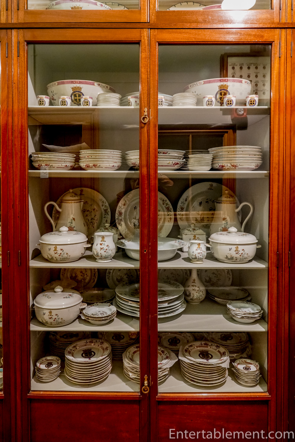 Glenn’s tableware reprieve was short-lived. My eye immediately travelled to the arched china displays at the far end of the room. There was information on these two sets. The one on the left is a Worcester Dinner service in the old Mosaik style, based on contemporary Imari patterns from Japan. It looks quite modern, doesn’t it? Perhaps it’s the colour block style that makes me think so.