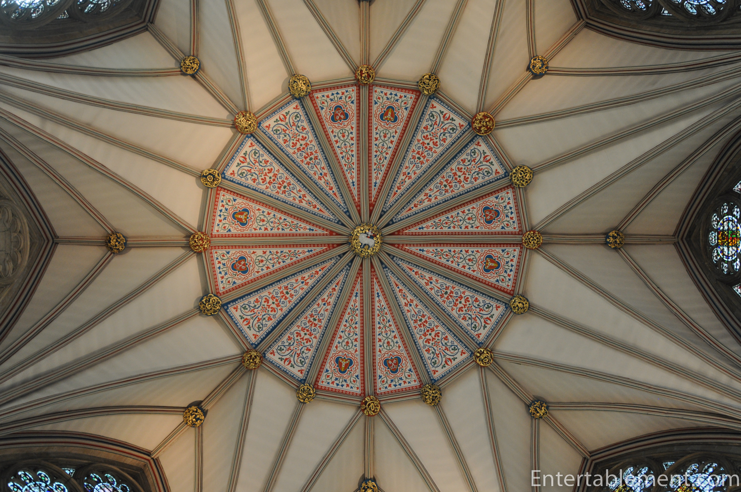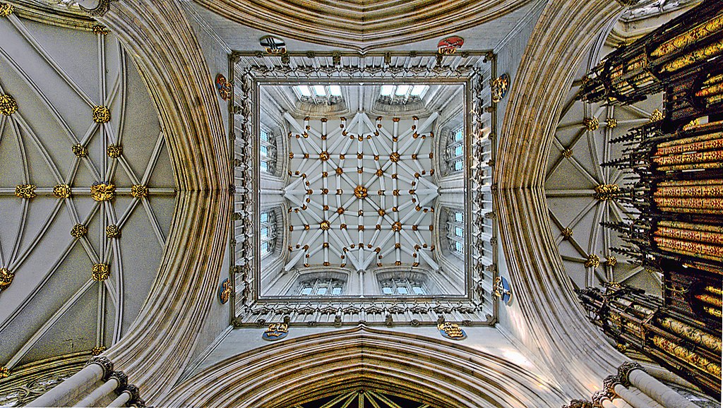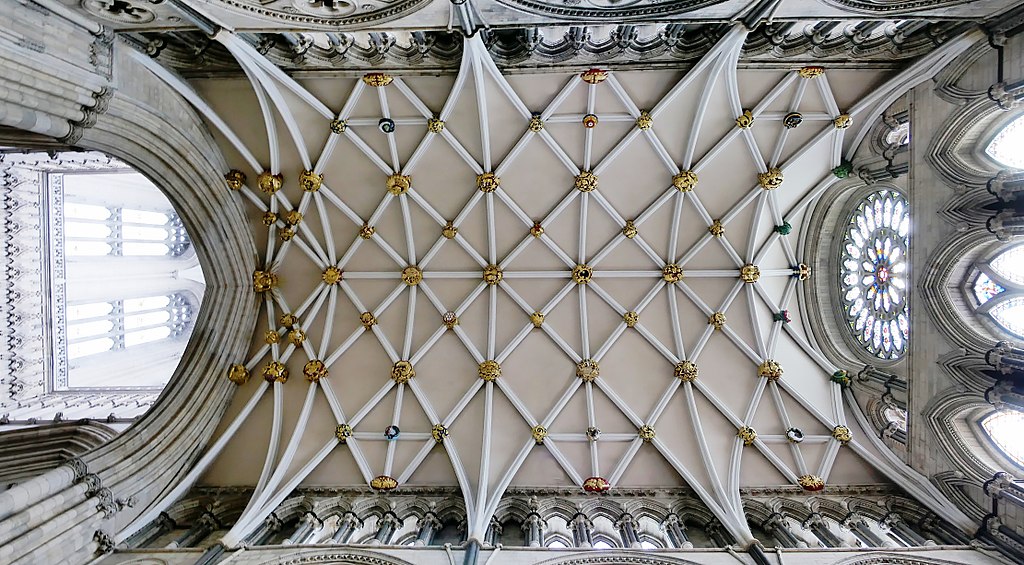 Construction of York’s Chapter House began towards the end of the 13th century. Several features make it extremely impressive. First, it has no central column holding up the roof, which, like the Minster’s Nave, is made of wood rather than stone. The span is large—58 ft, supported by a network of beams that delight engineers today.