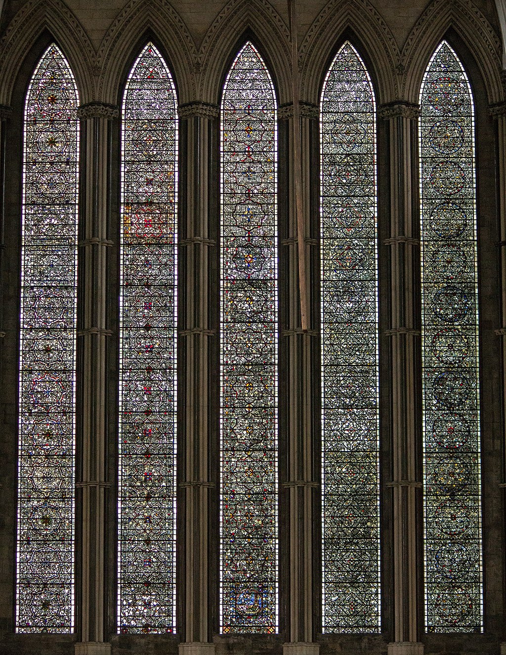 Each bay soars upward within single shafts of Purbeck marble, rising from floor to ceiling. Within each section, one ground-level lancet arch gives rise to four above it at the triforium on the second level and five lancet arches of the clerestory at the top.