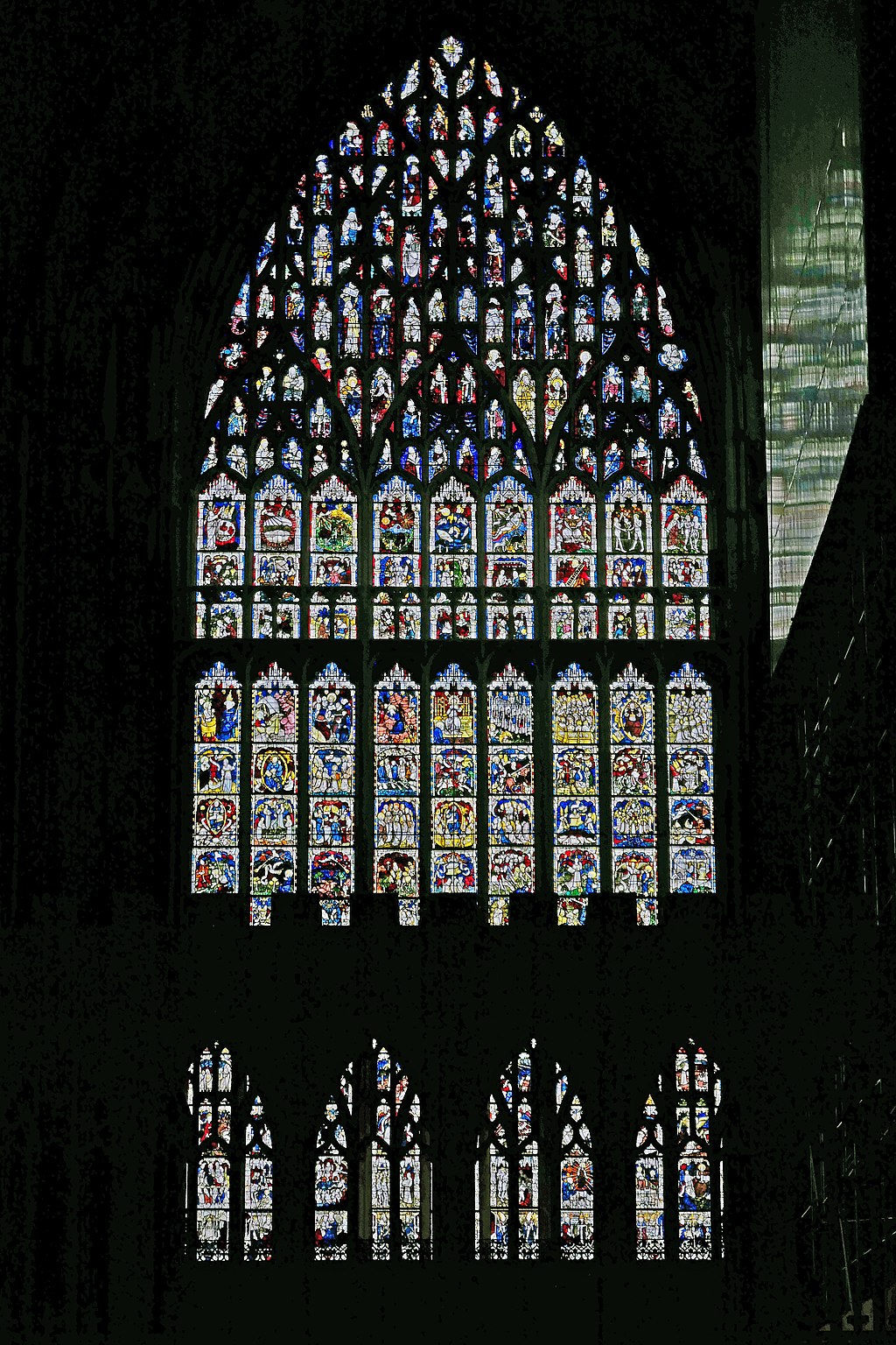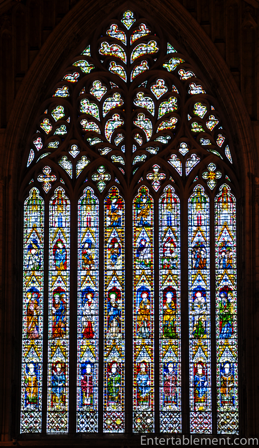 It is almost a guidebook to the hierarchy of the church. Bishops are depicted on the bottom layer and saints above. Events of the bible are depicted in the third row from the bottom, topped with the Coronation of the Virgin in the fourth. All we know of the people who created it are their names: Master Ivo was the craftsman who built the tracery; Master Robert created the glass.