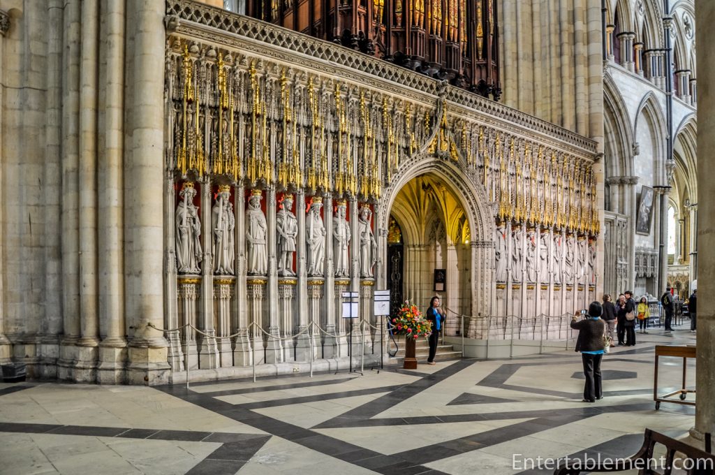It’s difficult to detect, but it’s asymmetrical—the door is off-centre. It holds fifteen statues. You can count seven on the left (see above) and eight on the right (see below). They are monarchs William I to Henry V; the latter’s early demise necessitated the quick addition of Henry VI, throwing off the balance. The political aspect of this screen was further heightened when the same Henry VI was murdered, prompting its removal to accommodate his cult following, eager to venerate a saint that never did get canonized. It was later replaced by the Victorians during their restoration. (As an aside, Henry VII also anticipated Henry VI’s impending sainthood and built an enormous chapel at Westminster Abbey in preparation, only to have the chapel form his own mausoleum.)