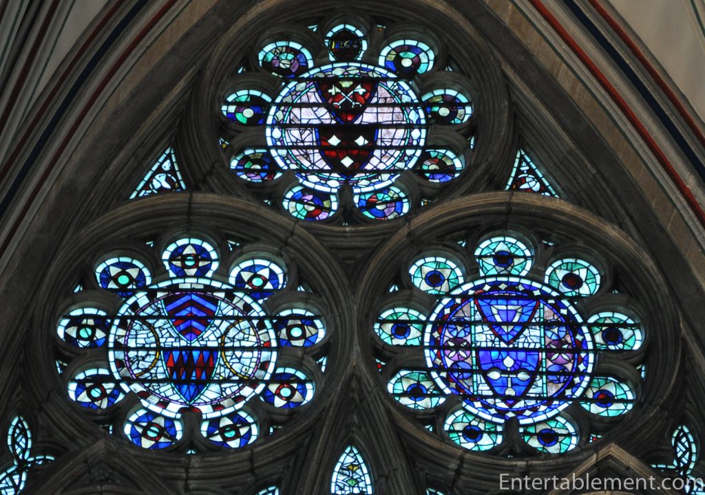 Let’s head now to the transepts, which were begun in 1220 and completed in 1250. In the North Transept, we find the Five Sisters Window, dating from 1255. At 53 feet high, the lancets are the tallest in England. The original glass comprises 100,000 tiny pieces of grey, touched with dots of colour. At the bottom of the central panel is a tiny depiction of Daniel in the Lion’s Den, included from an earlier Norman window. Otherwise, the pattern is abstract.