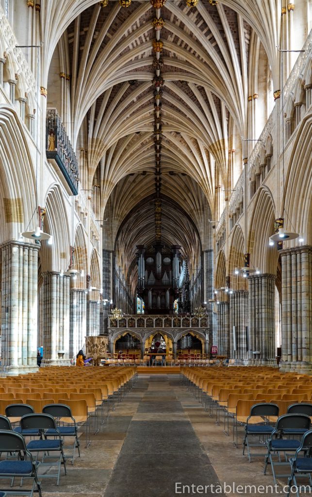 Exeter is a scrumptious frothy wedding cake of a cathedral with the longest continuous vault in Europe. While it retains its sturdy Norman towers, the majority of what we see today is of the exuberant Decorated gothic design and was completed around 1400.