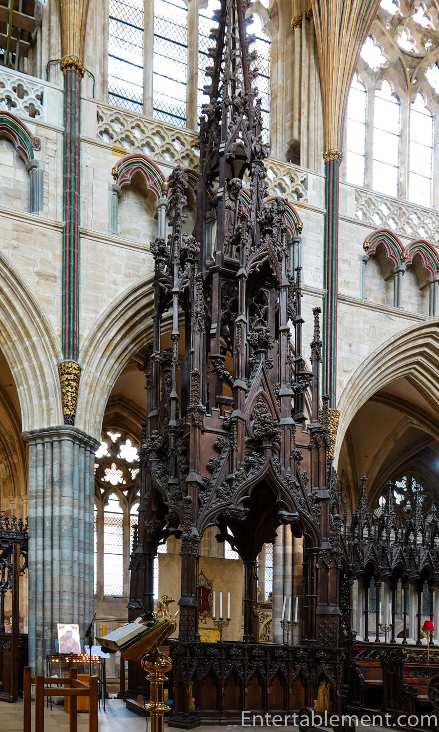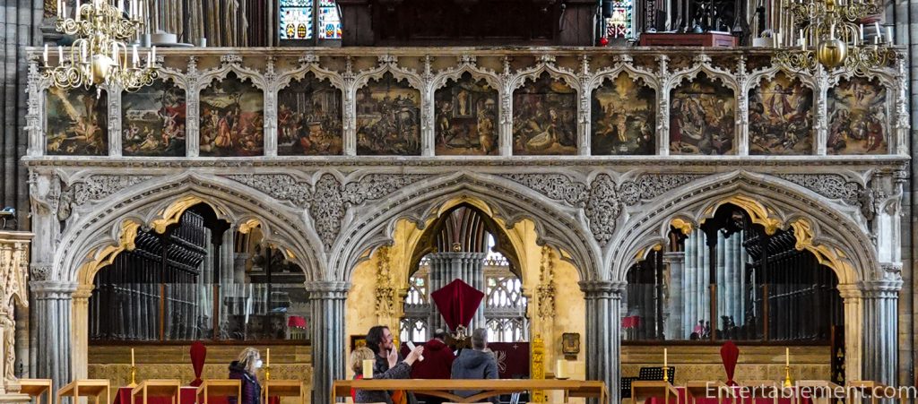 Let’s go back into the nave and work our way east, where we see the pulpitum with its three arches surmounted by an openwork balustrade. Created by Thomas of Witney, it dates from 1324.