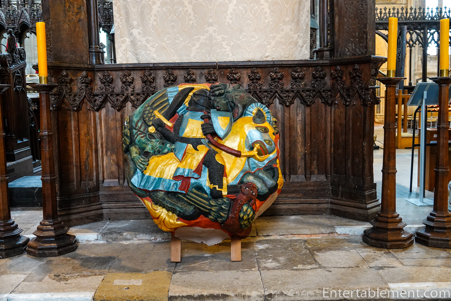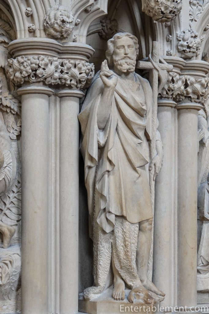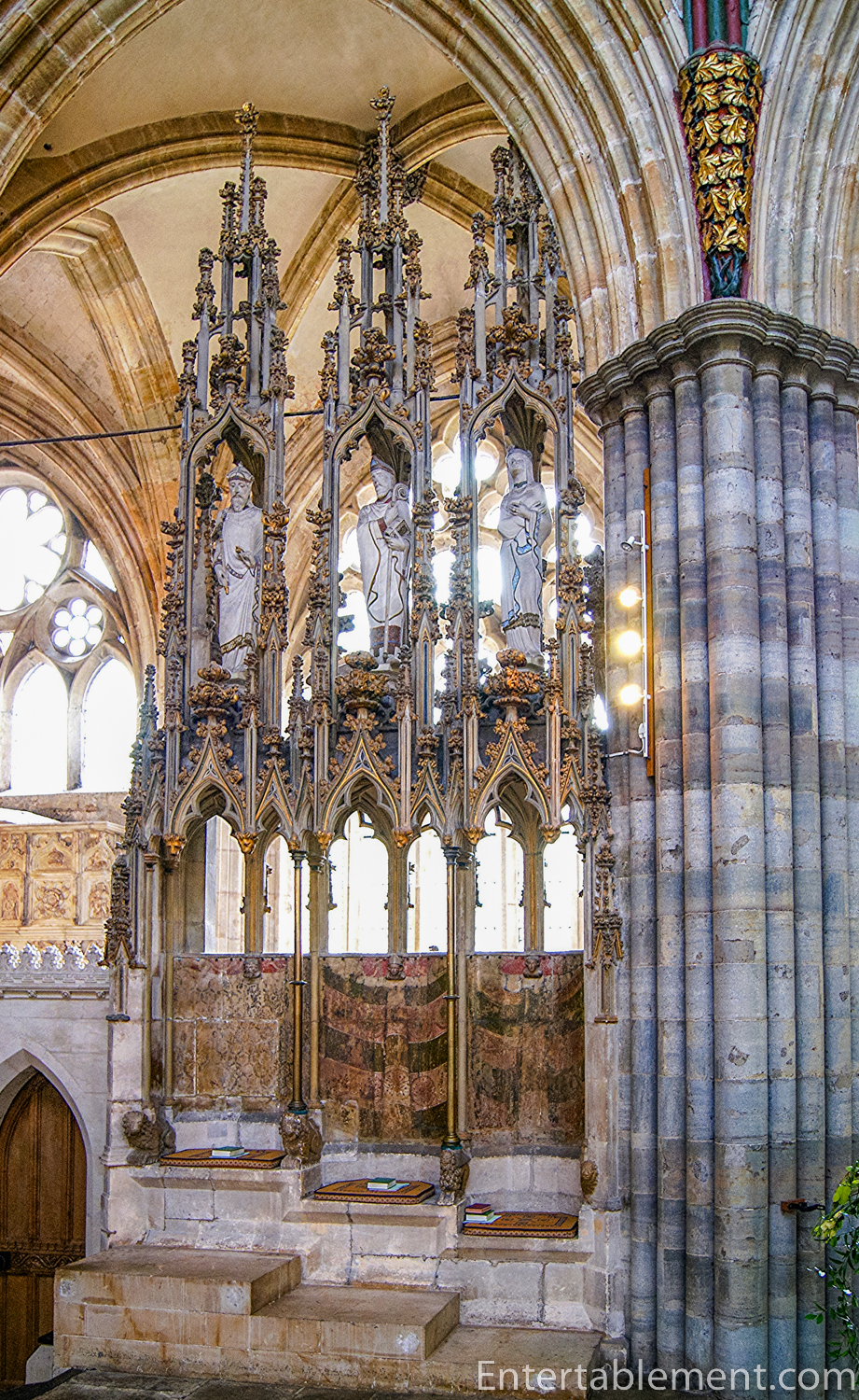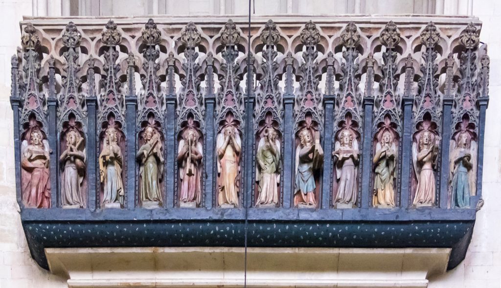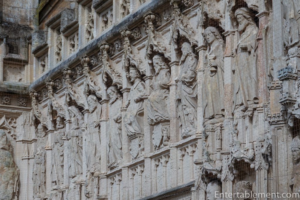 The lowest of the three tiers of sculptures are angels, with kings and knights above them. Saints and apostles comprise the top row. Some are sitting, others are standing, and a few have their legs crossed; two are arguing. Initially, the images would have been entirely coloured; it’s difficult to imagine what a vision that might have been!