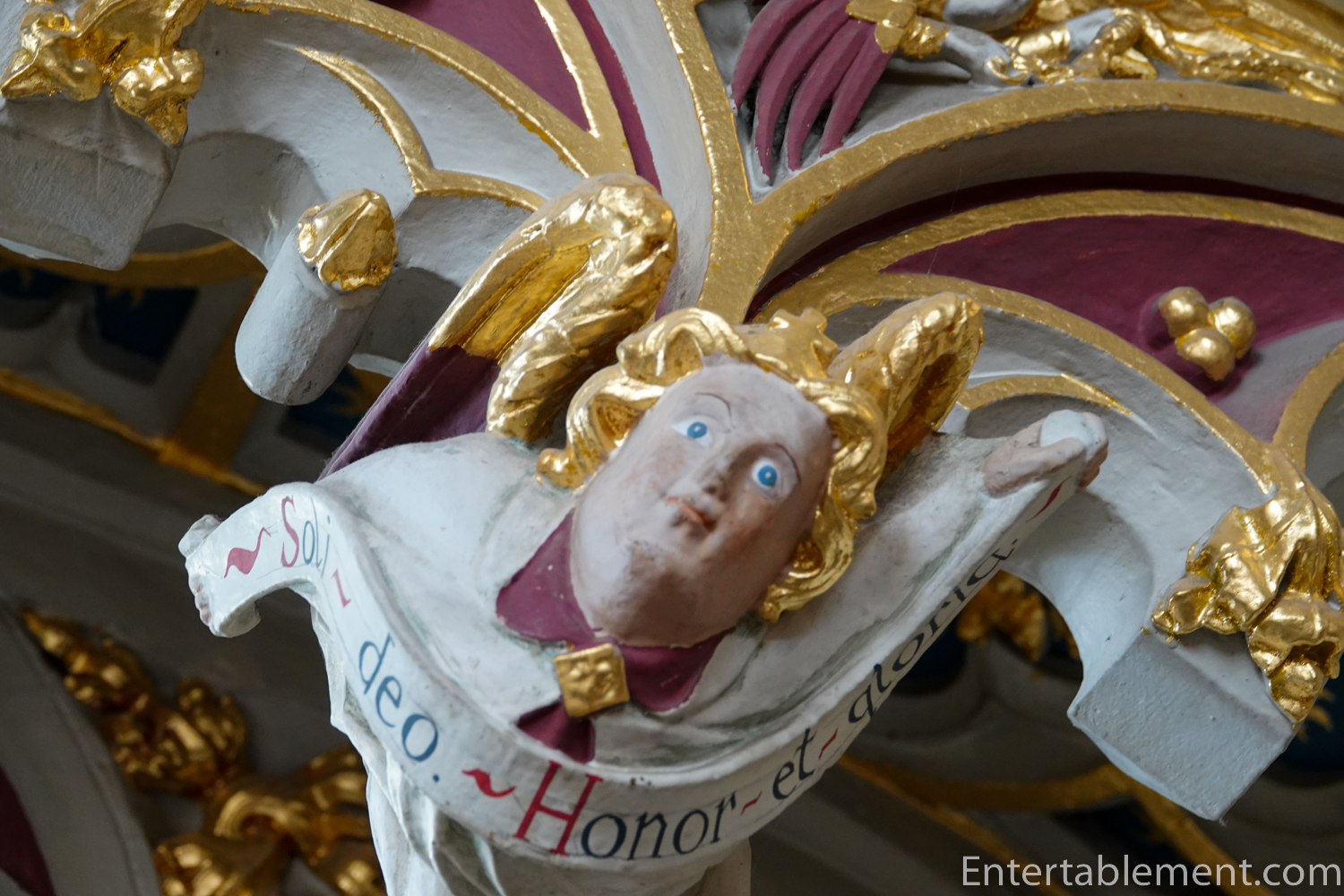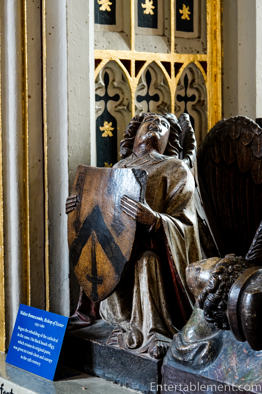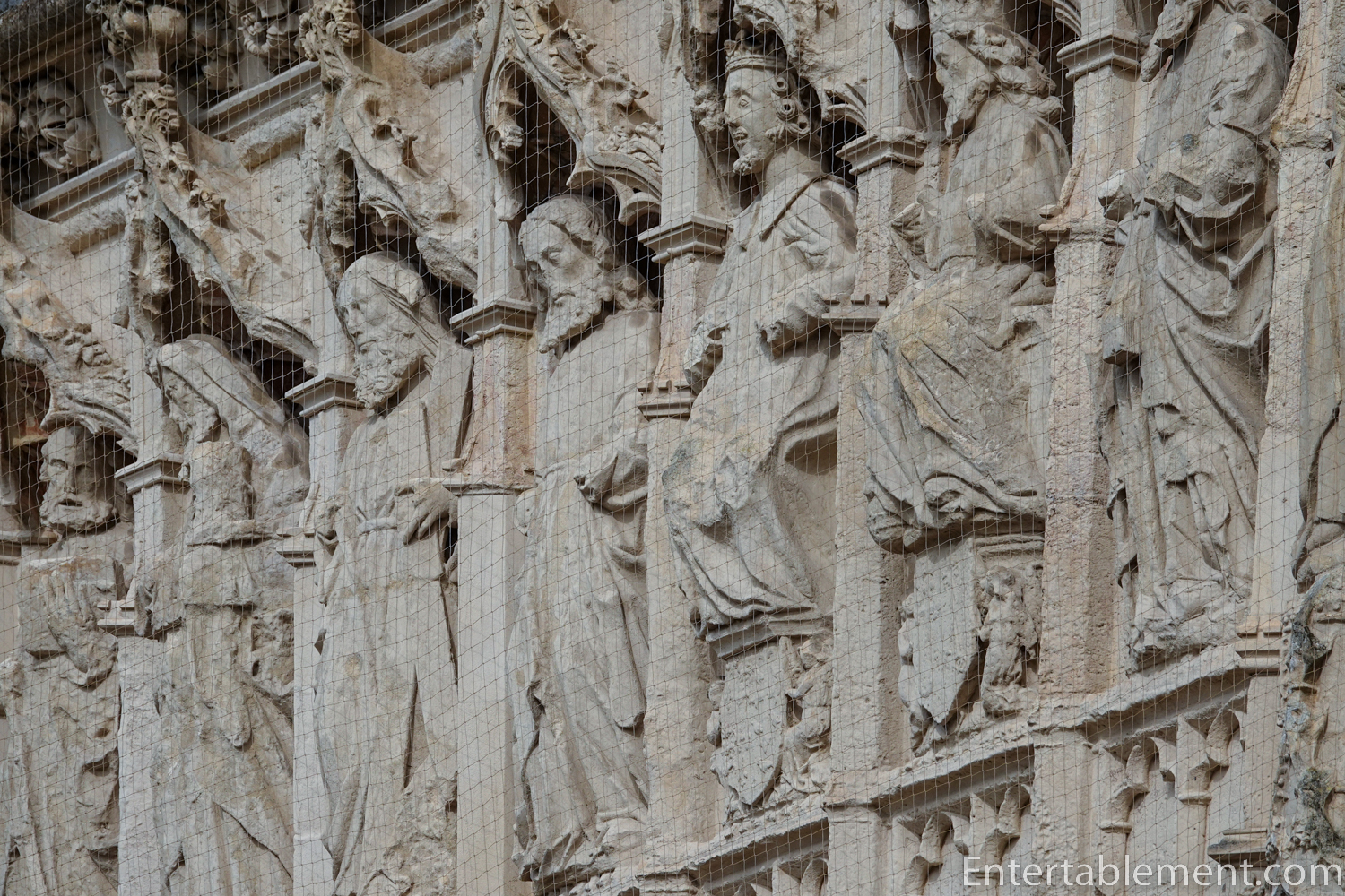 The lowest of the three tiers of sculptures are angels, with kings and knights above them. Saints and apostles comprise the top row. Some are sitting, others are standing, and a few have their legs crossed; two are arguing. Initially, the images would have been entirely coloured; it’s difficult to imagine what a vision that might have been!