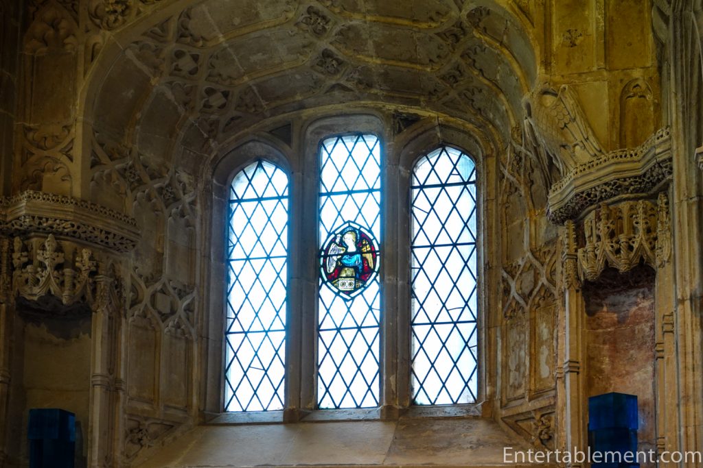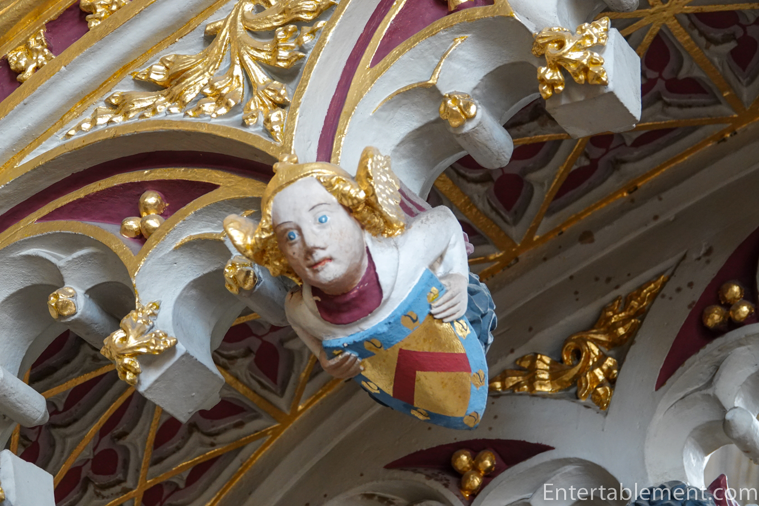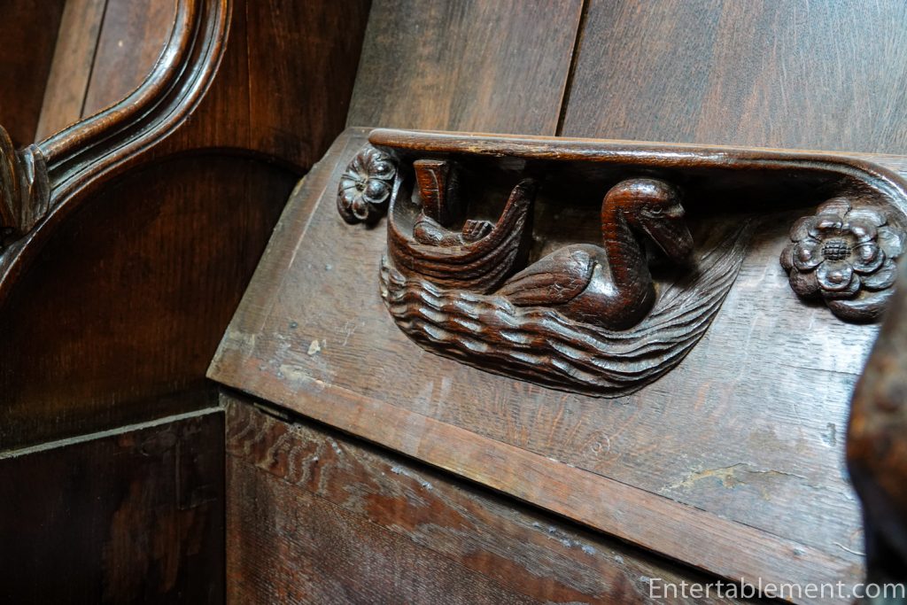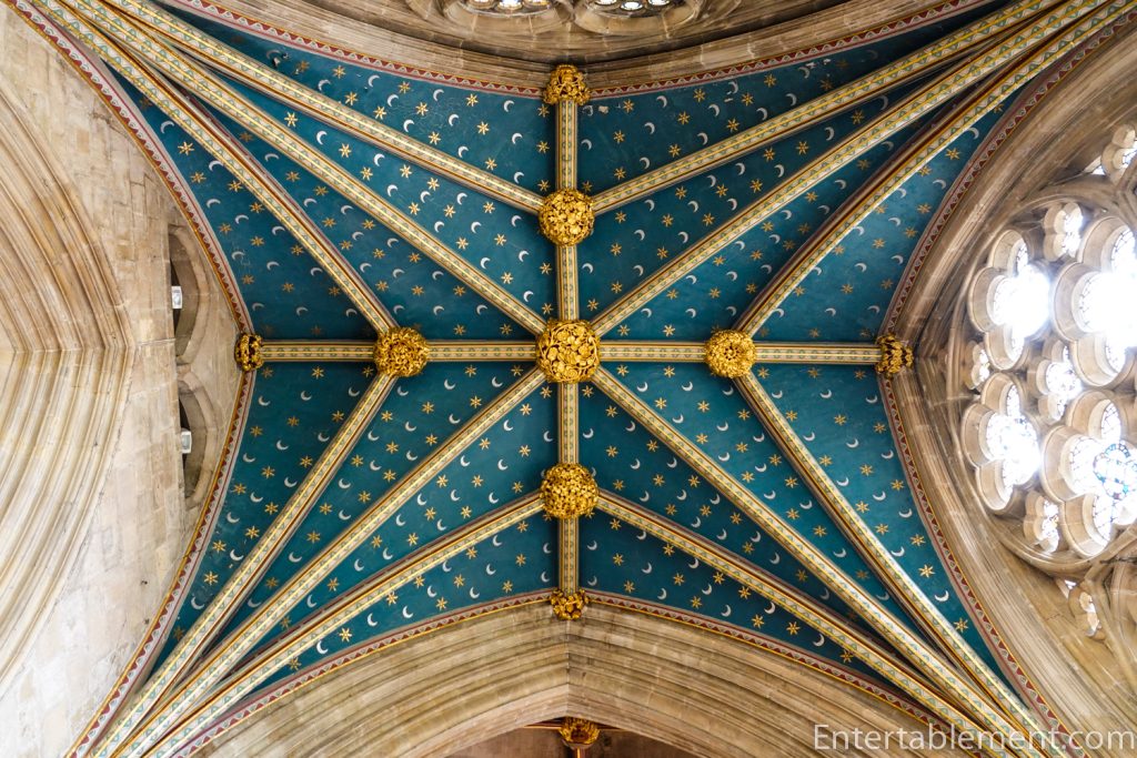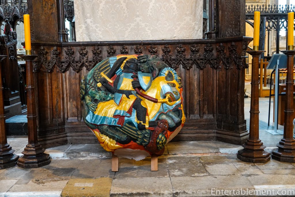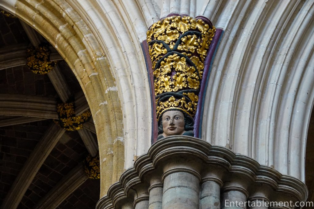 The minstrel’s gallery sits high on the north wall, with a frieze of colourful angels playing musical instruments—bagpipes, harp, gittern, shawm and portative organ (according to the website); I’m not sure what half those instruments are. The gallery was likely used by musicians or singers, though that is not certain. Behind the balcony is a section of the cathedral organ, which carries additional sound directly into the centre of the nave.