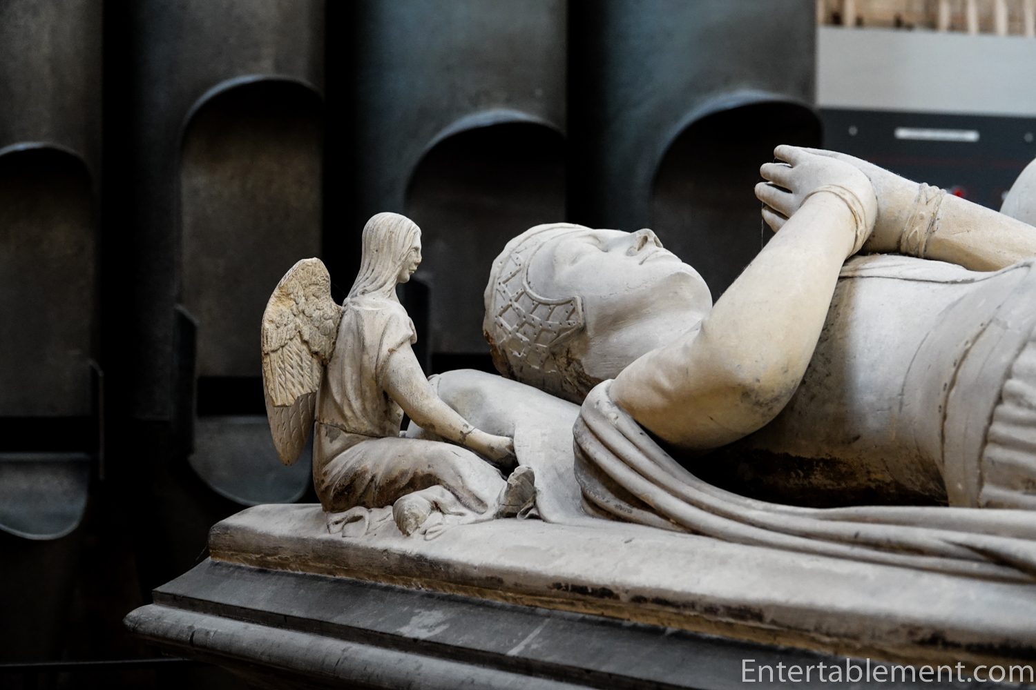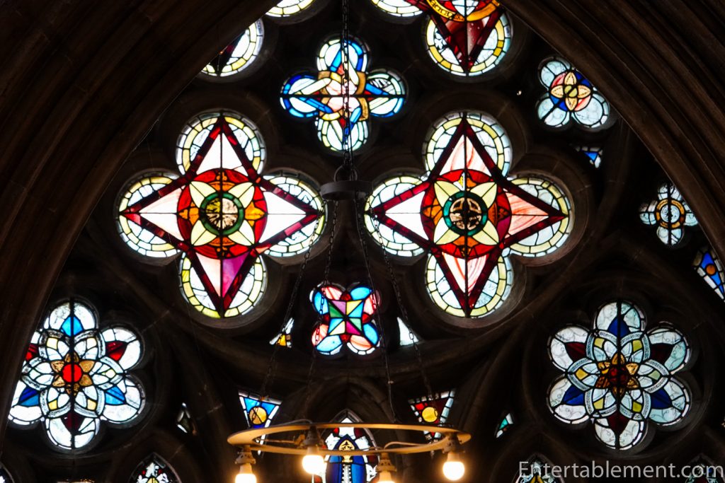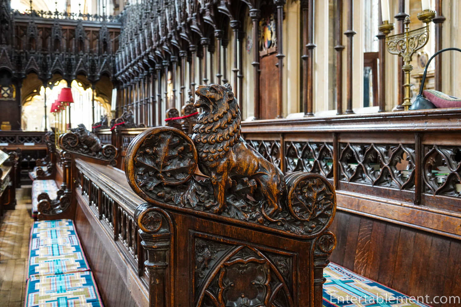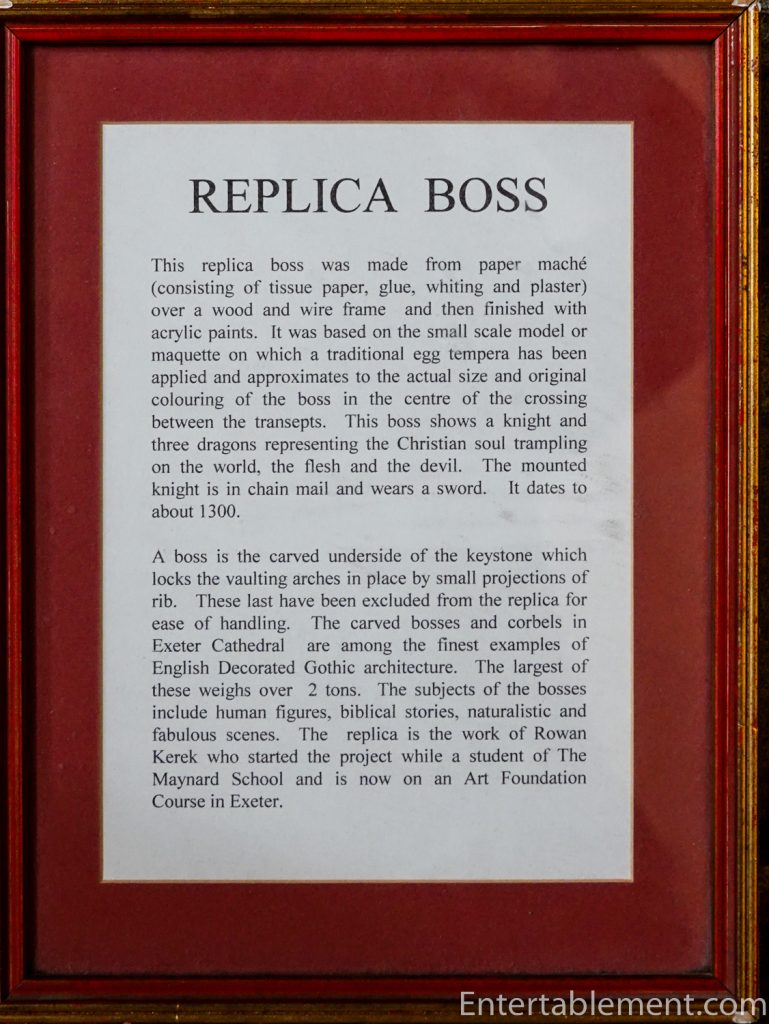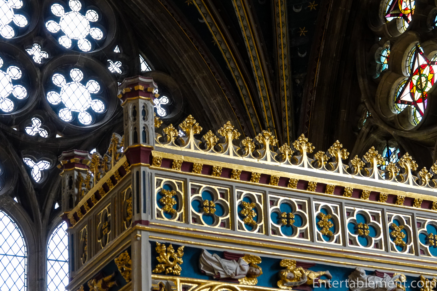 The minstrel’s gallery sits high on the north wall, with a frieze of colourful angels playing musical instruments—bagpipes, harp, gittern, shawm and portative organ (according to the website); I’m not sure what half those instruments are. The gallery was likely used by musicians or singers, though that is not certain. Behind the balcony is a section of the cathedral organ, which carries additional sound directly into the centre of the nave.