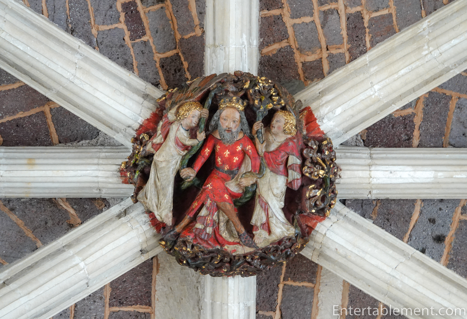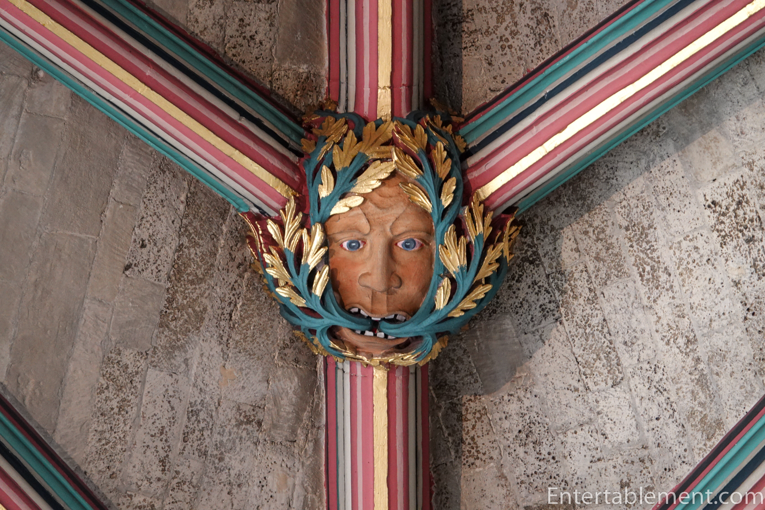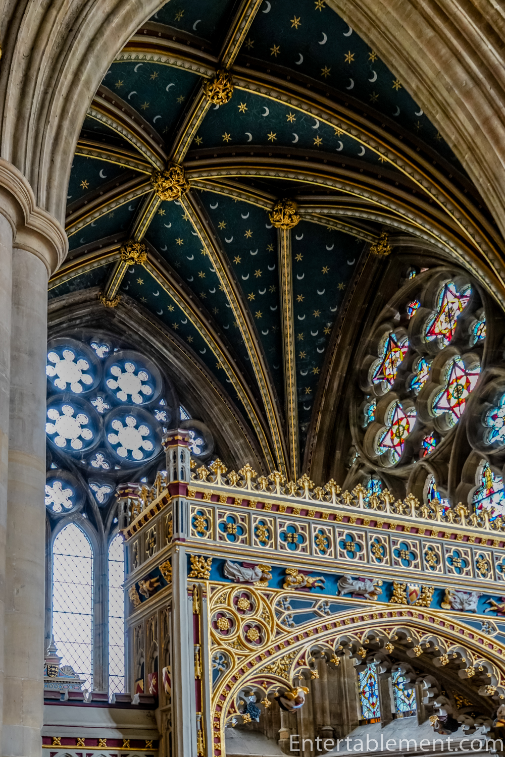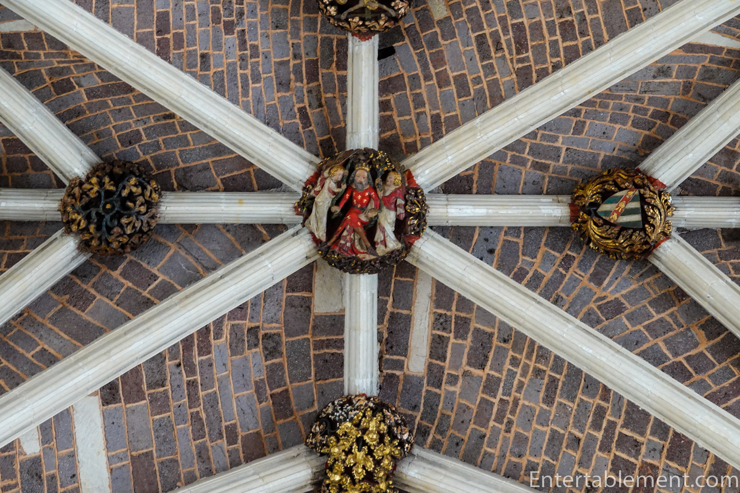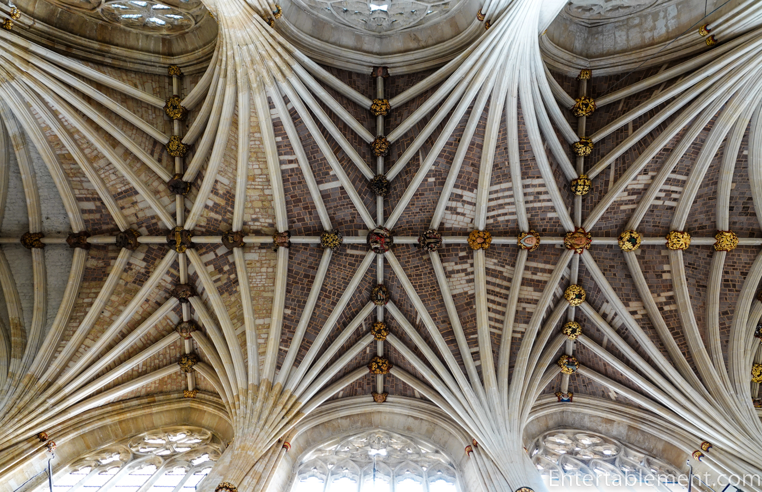 Looking up, the vaulted ceiling is a cluster of arch mouldings and ribs, dotted with what look to be tiny little bosses.