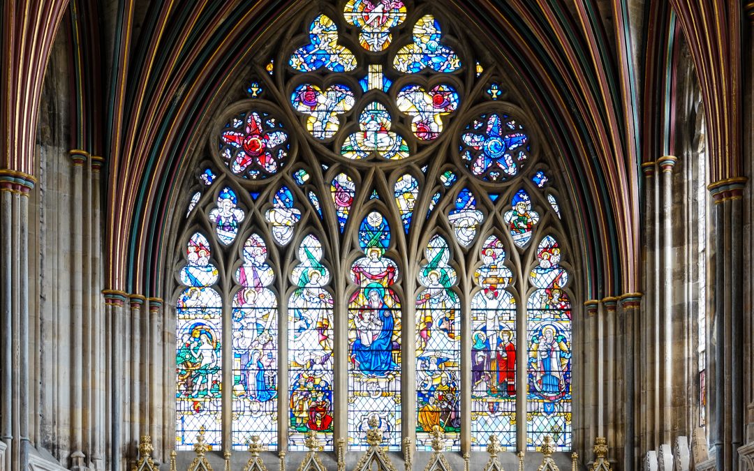 Above the west door is a Decorated Gothic rose window filled with leaded glass.