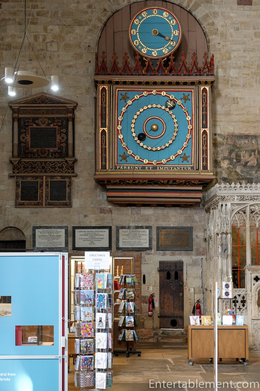 Because Exeter doesn’t have a central tower, it doesn’t have a crossing; the two towers form transepts of a sort. In the North Transept is an astronomical clock (the turquoise square below), a working model of the solar system as it was understood.