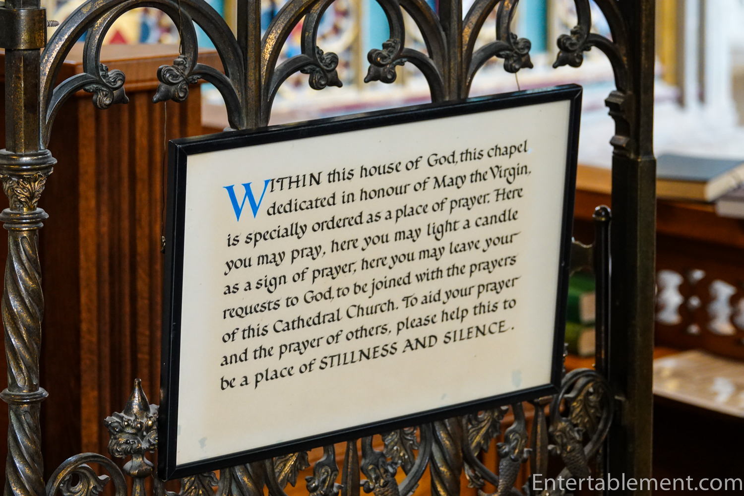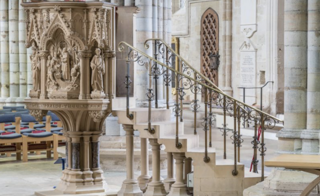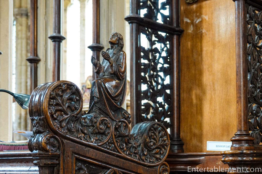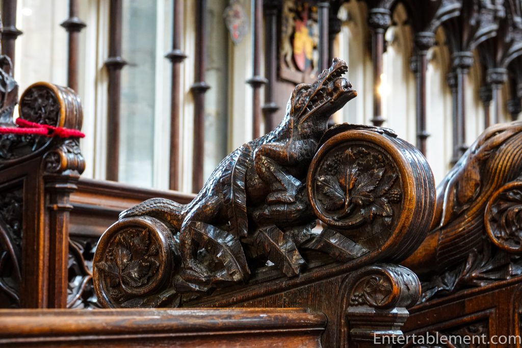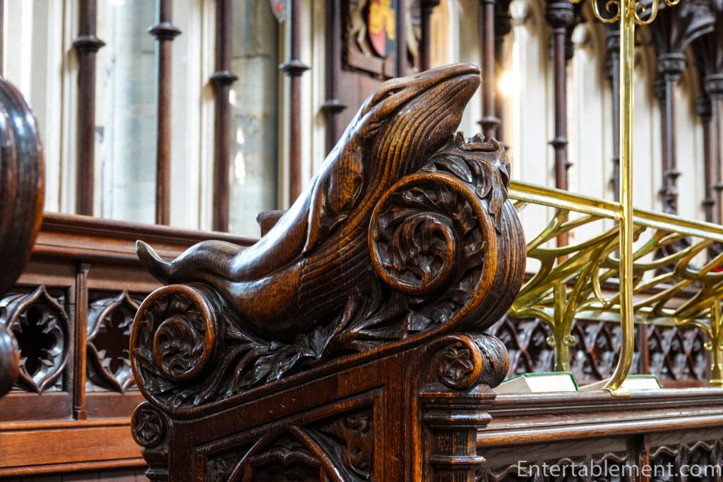 The Martyr’s Pulpit is just to the left of the Pulpitum, erected in memory of Bishop John Coleridge Patteson who was ordained in the Cathedral. The detailed carvings might lead you to think it’s made of wood, but it’s very evenly-grained sandstone. Designed by Sir George Gilbert Scott in the 1870s, its detailed and lifelike stone carvings have been described as the pulpitum in miniature.