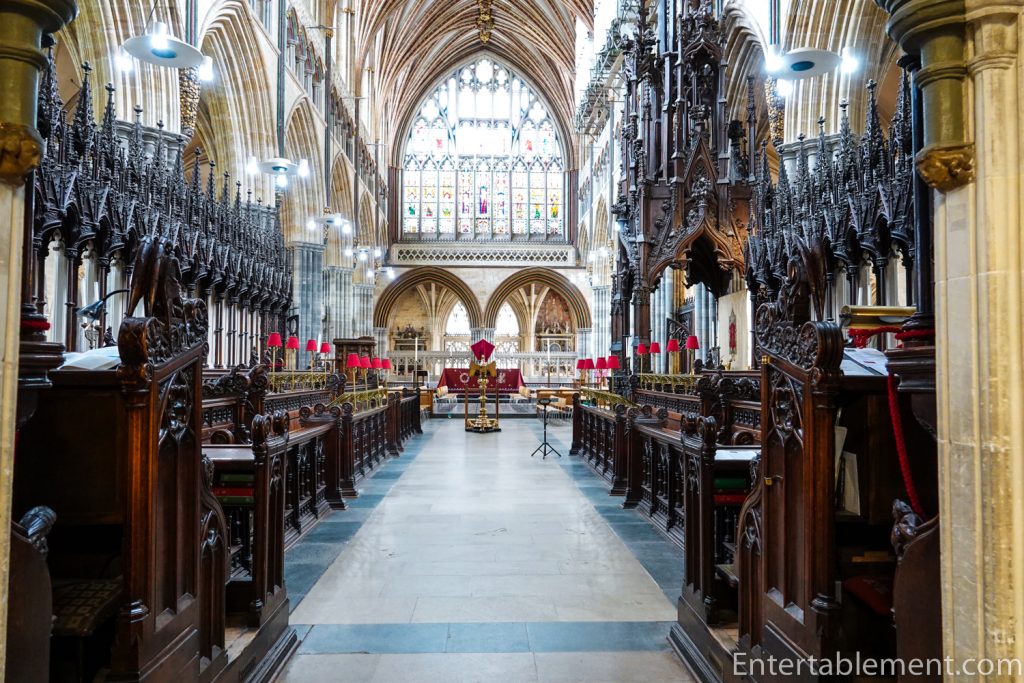 The Bishop’s Throne, designed for Bishop Stapledon (for whom the current Cathedral Cat is currently named) is tucked in at the centre of the south (right) choir stalls. Thomas of Witney designed it in1313 and was paid the fantastic sum of 12 shillings to complete it in a month. Originally, it would have been gilded and painted.