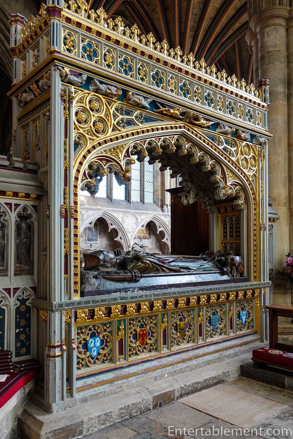 And speaking of thrones, the nearby sanctuary contains Thomas’s exuberant, triple-level sedilia, each with a gilded canopy above, topped by another niche containing a statue with another canopy above. Remember I spoke of Exeter being a Cathedral with the confection of a wedding cake? Behold!