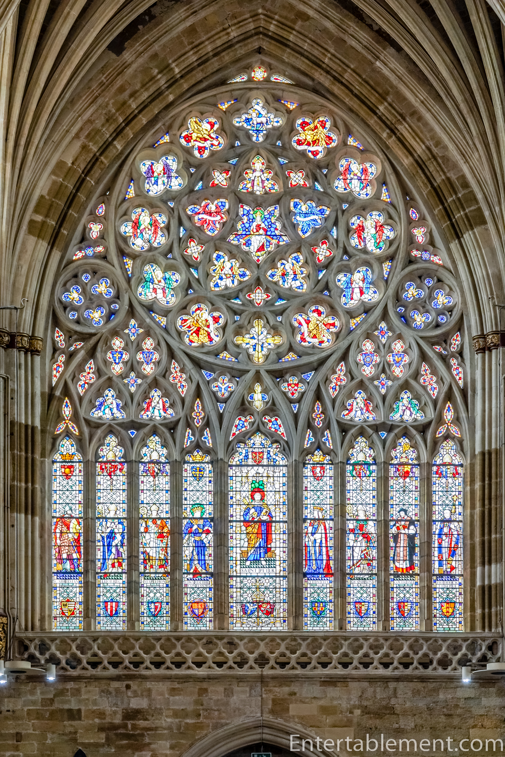 The Great East Window at Exeter is stunning. Nine figures date from around 1304; the three at the top of the window are Abraham, Moses and Isaiah, from the lettering on their scrolls. The other six are the outer figures of the bottom row, but the faces of these saints are not original. By 1390, the stonework of the original window had become unsafe, and a new window In the Perpendicular style was constructed. This is the tracery we see today. The original glass was mixed with new when the new window was completed in 1391.