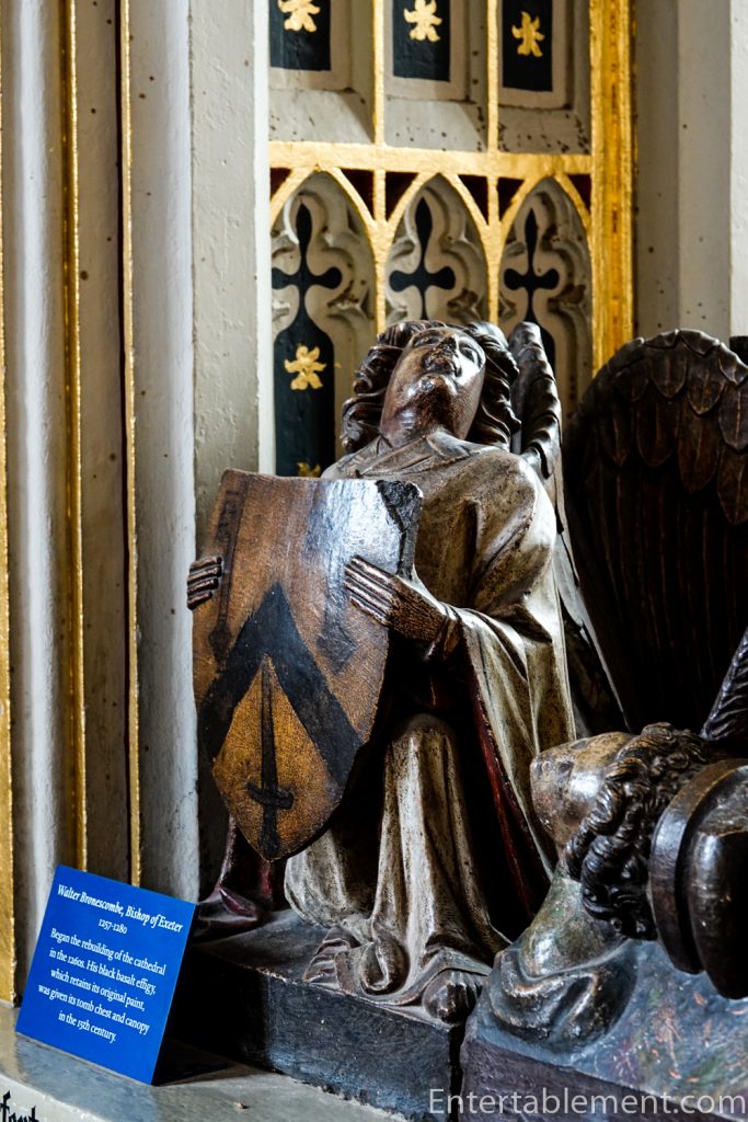 In 1338, a new Bishop, Grandisson, left his mark on the west front with a low screen of sculpture, similar to what we might find at Wells or Lincoln. But, unfortunately, it wasn’t completed until 1375; by then, Grandisson had passed away, and the Black Death had finished off the designer, William Joy.