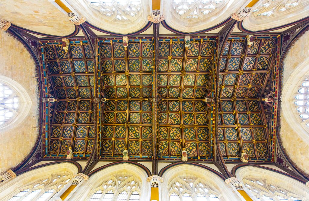 The panels in the balustrade each contain a Jacobean painting of a biblical scene, which replace panels destroyed during the Reformation (no doubt they held graven images, a big no-no at the time). Next time I visit, I must get better close-ups of the carved foliage in the triangular sections between the arches. They’re almost like lace, so deeply cut they are into the surface of the stone.