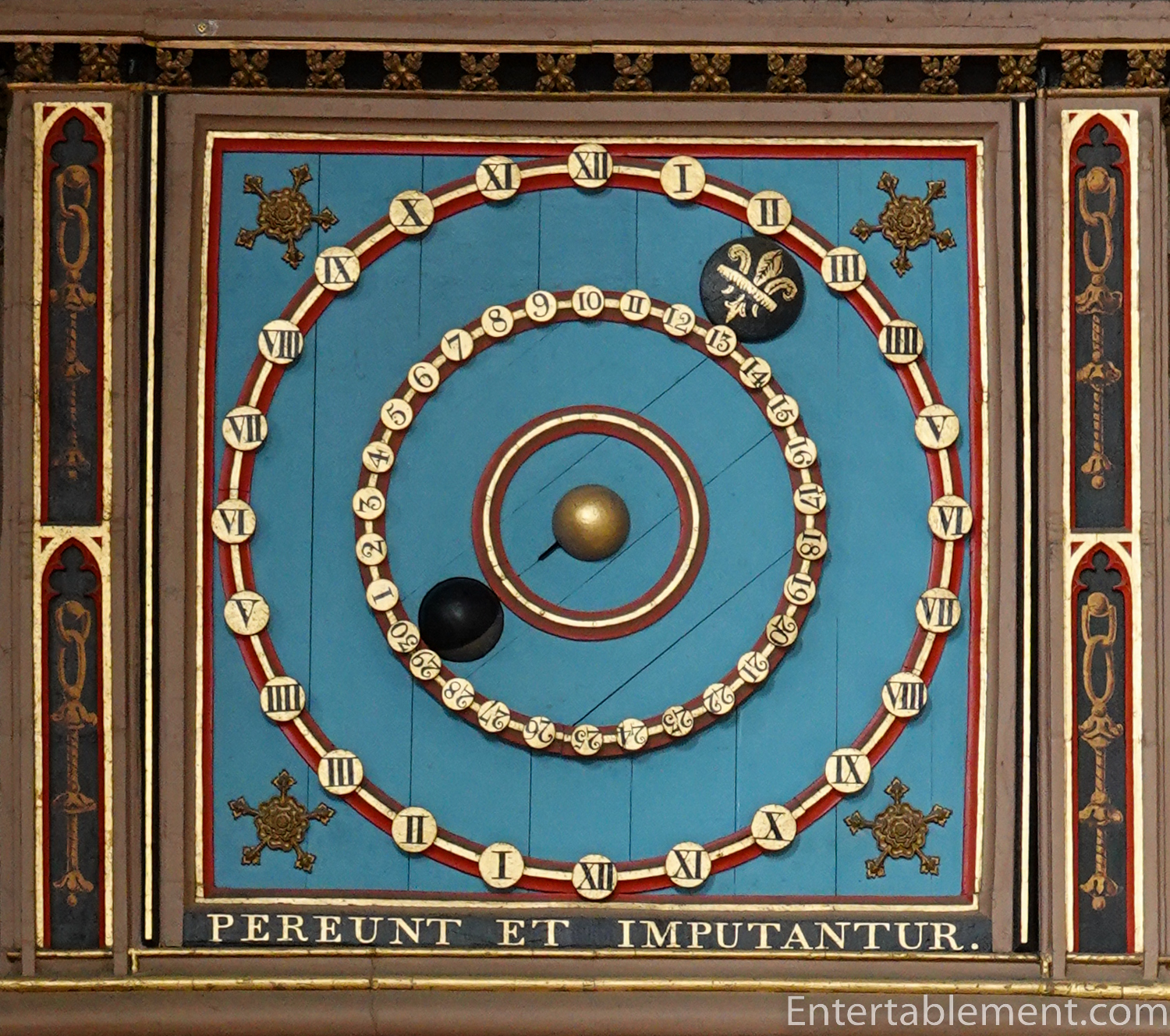 The gold ball in the centre represents the earth. The black ball with the fleur-de-lys represents the sun, and it circles the dial every 24 hours, with the outer ring marking the time of day and the inner ring is the day in the lunar month. The black ball represents the moon. Half of its surface is black, and the other half is silver; it rotates on its axis to show the correct phase of the moon.