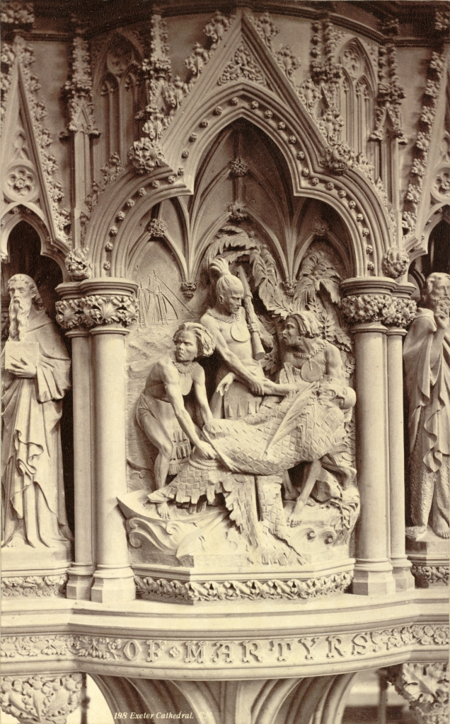 The figures of three early Christian martyrs are also carved on this pulpit: St Stephen, St John the Baptist and St Paul. Not sure which one this is, but the subject reminds me of my mother, who dismissed sighing, or long-suffering behaviour as acting like an “early Christian martyr”.