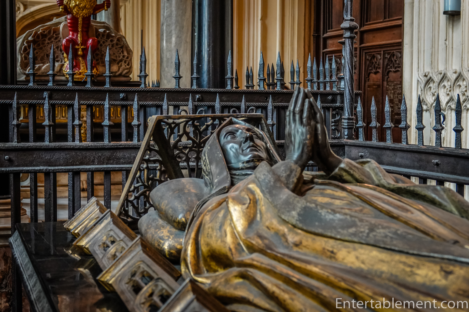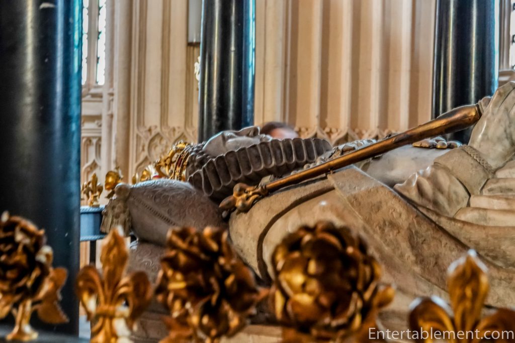 Of the more than thirty tombs in the chapel, let’s just focus on a couple. The effigy of Queen Elizabeth I is clad in an enormous Elizabethan ruff with a crown on her head.