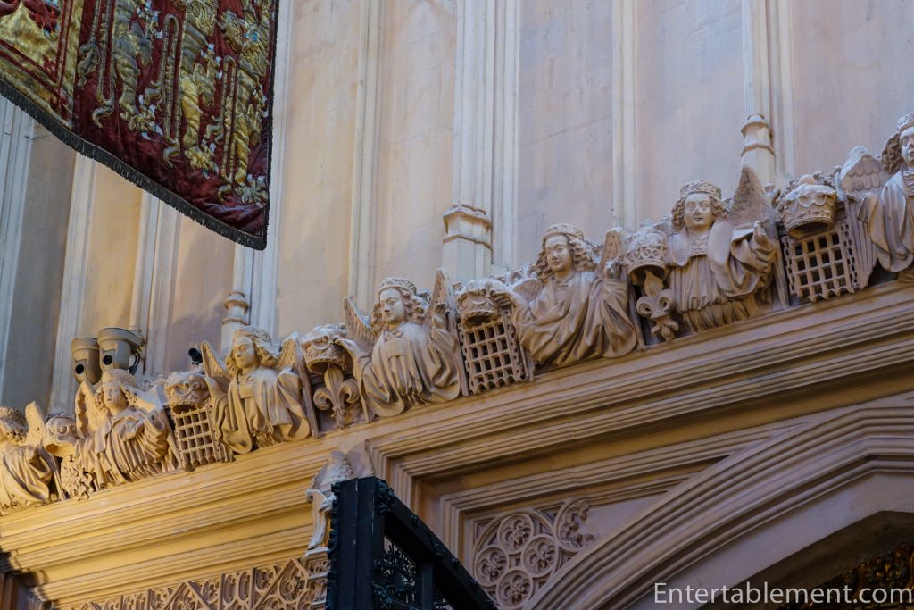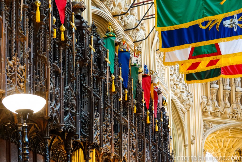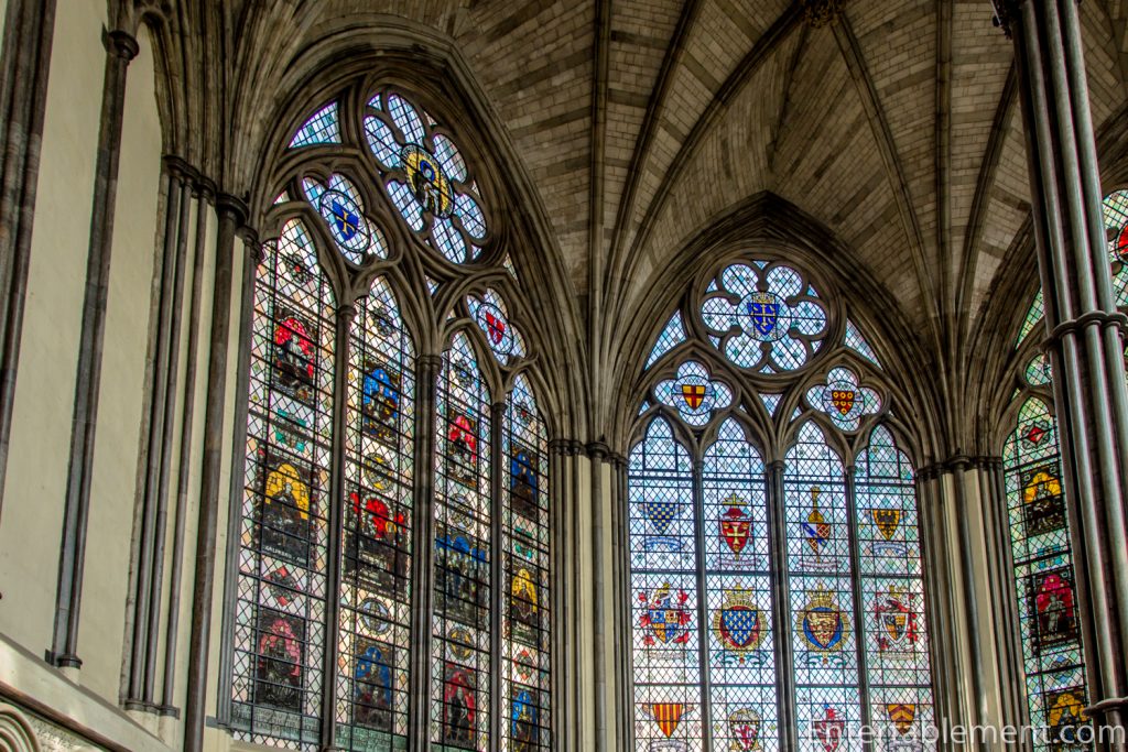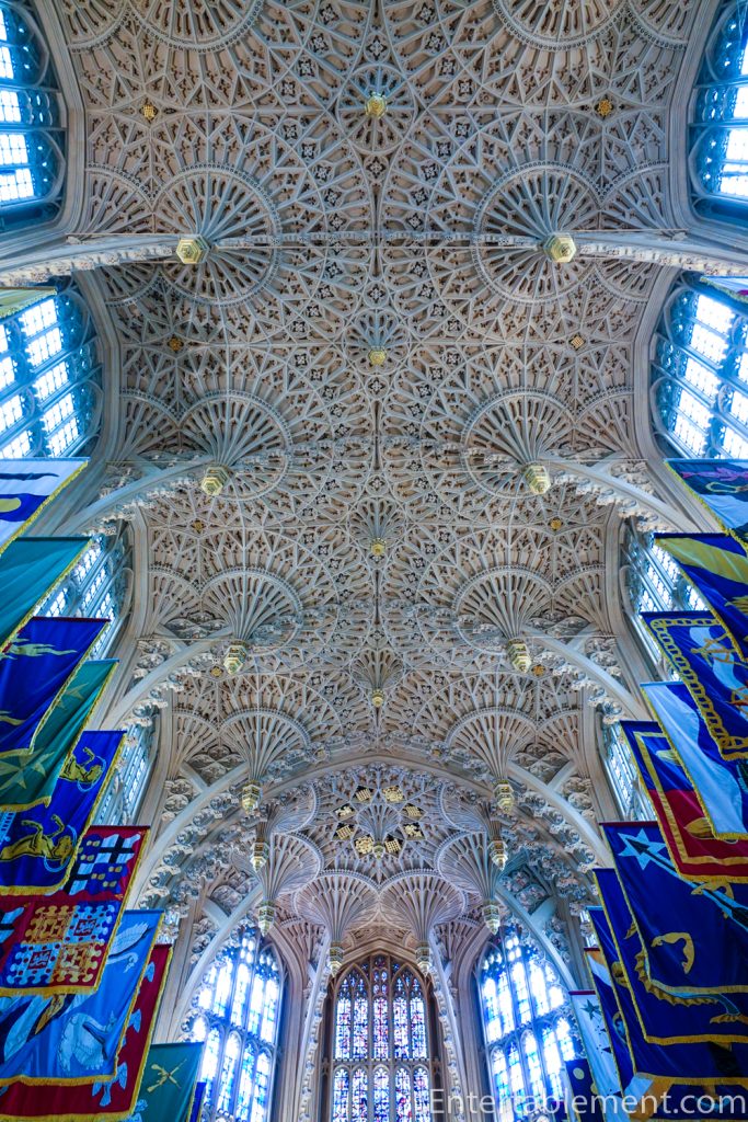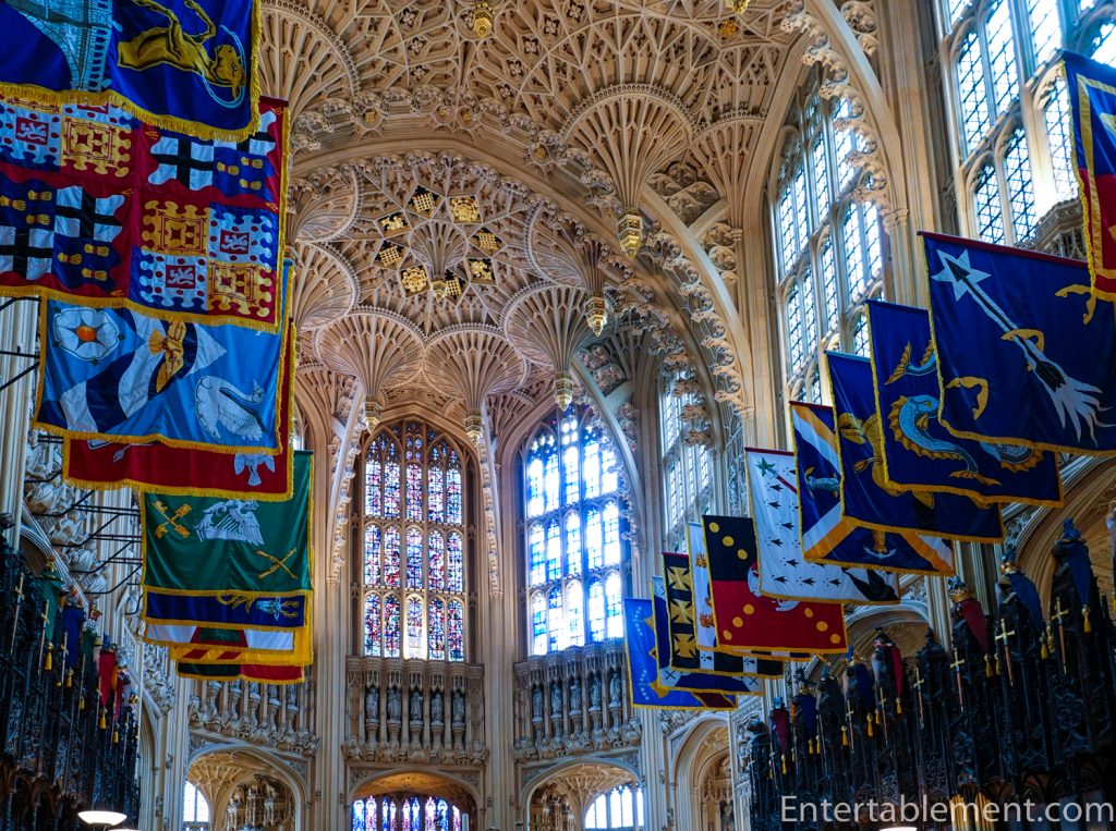 Moving on to the architecture (play the building, not the monarch), the walls are almost entirely composed of Perpendicular stained glass windows. The banners are of the members of the Order of the Bath.