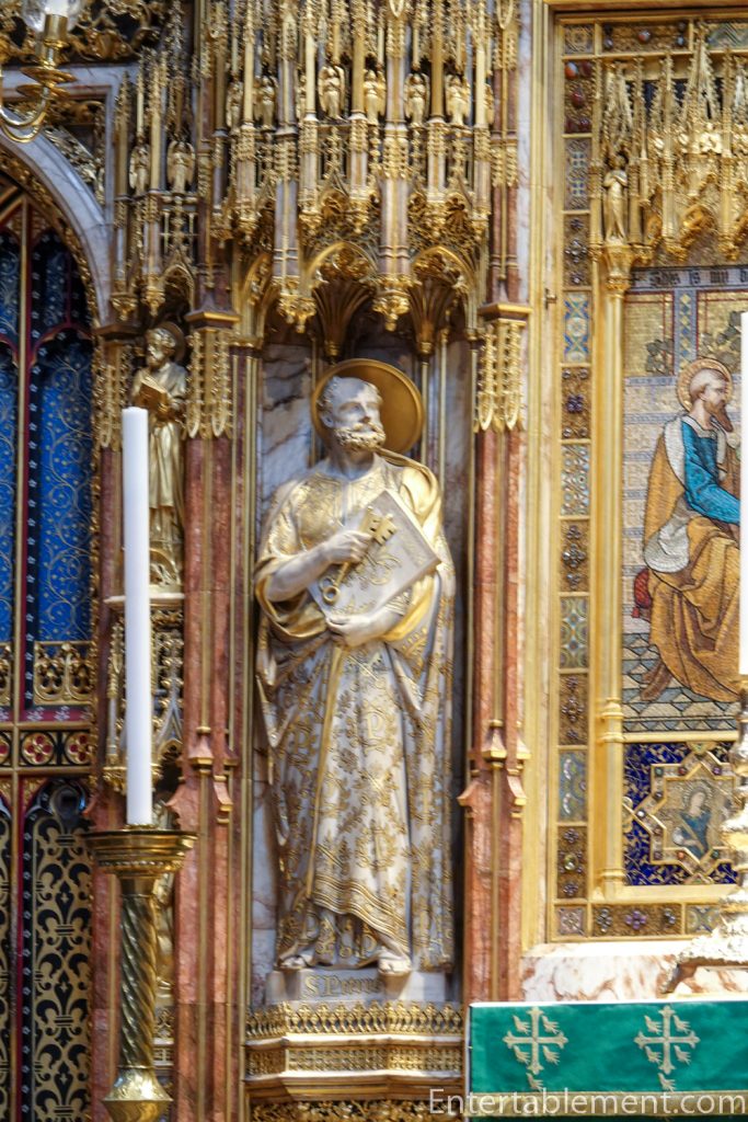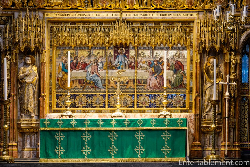 Behind the high altar is George Gilbert Scott’s reredos, a Victorian confection made of alabaster, marble, cedar and porphyry, embellished with jewels. The centre panel is a mosaic of the Last Supper by Antonio Salviati.