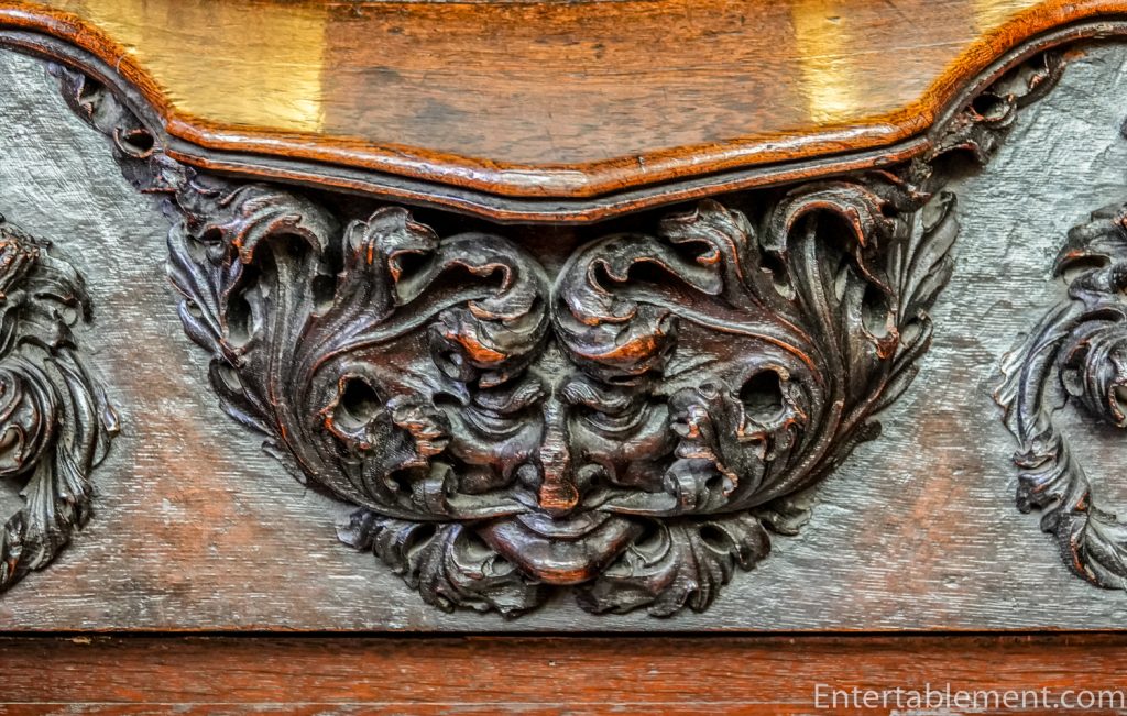 And Grotesque face with foliage issuing from its mouth. Fruit and foliage at the sides.