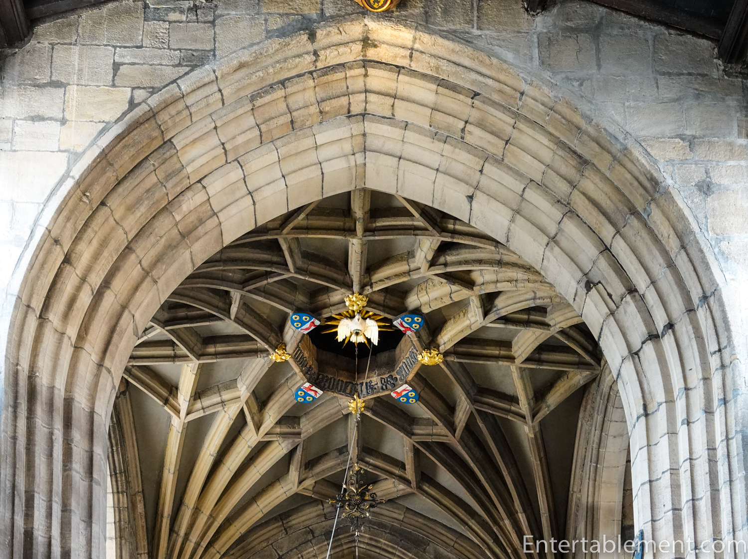 The carved bosses are painted with heraldic symbols.