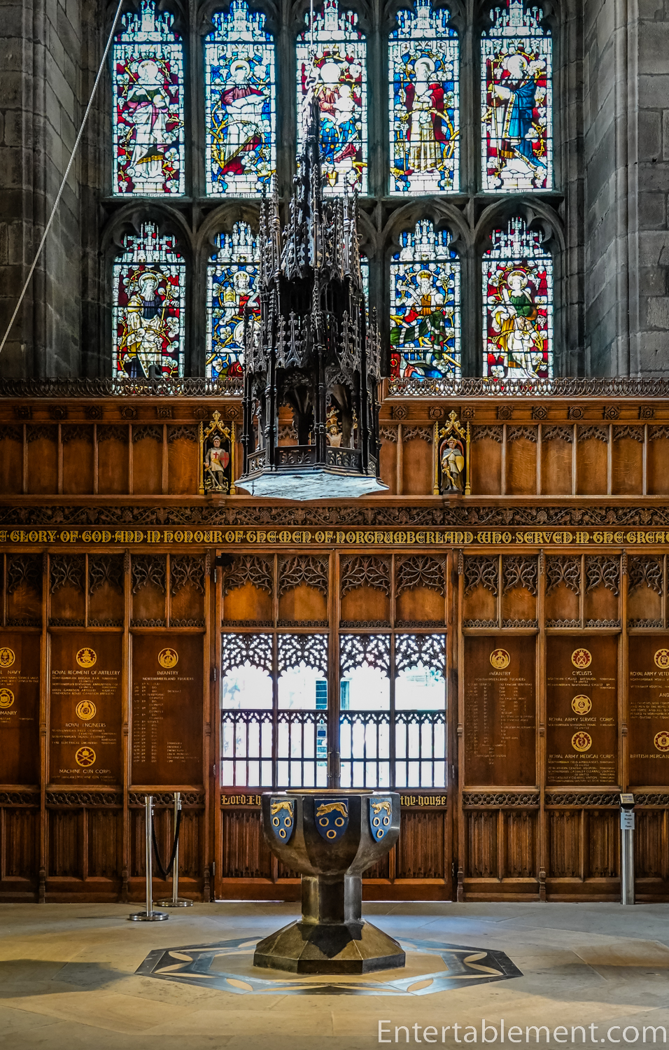 During that same raid, the 15th-century limestone base was dismantled and hidden. Its creator, stone mason Cuthbert Maxwell, had just witnessed the destruction of the font at St John’s in Grainger Street and was determined to take precautions. Benefactor Robert Rhodes’ coat of arms surrounds it, and the ceiling above is inscribed with this name. (I would have thought that was a giveaway to marauders, but vanity carried the day). The font remained concealed until many years later and has been carefully conserved.